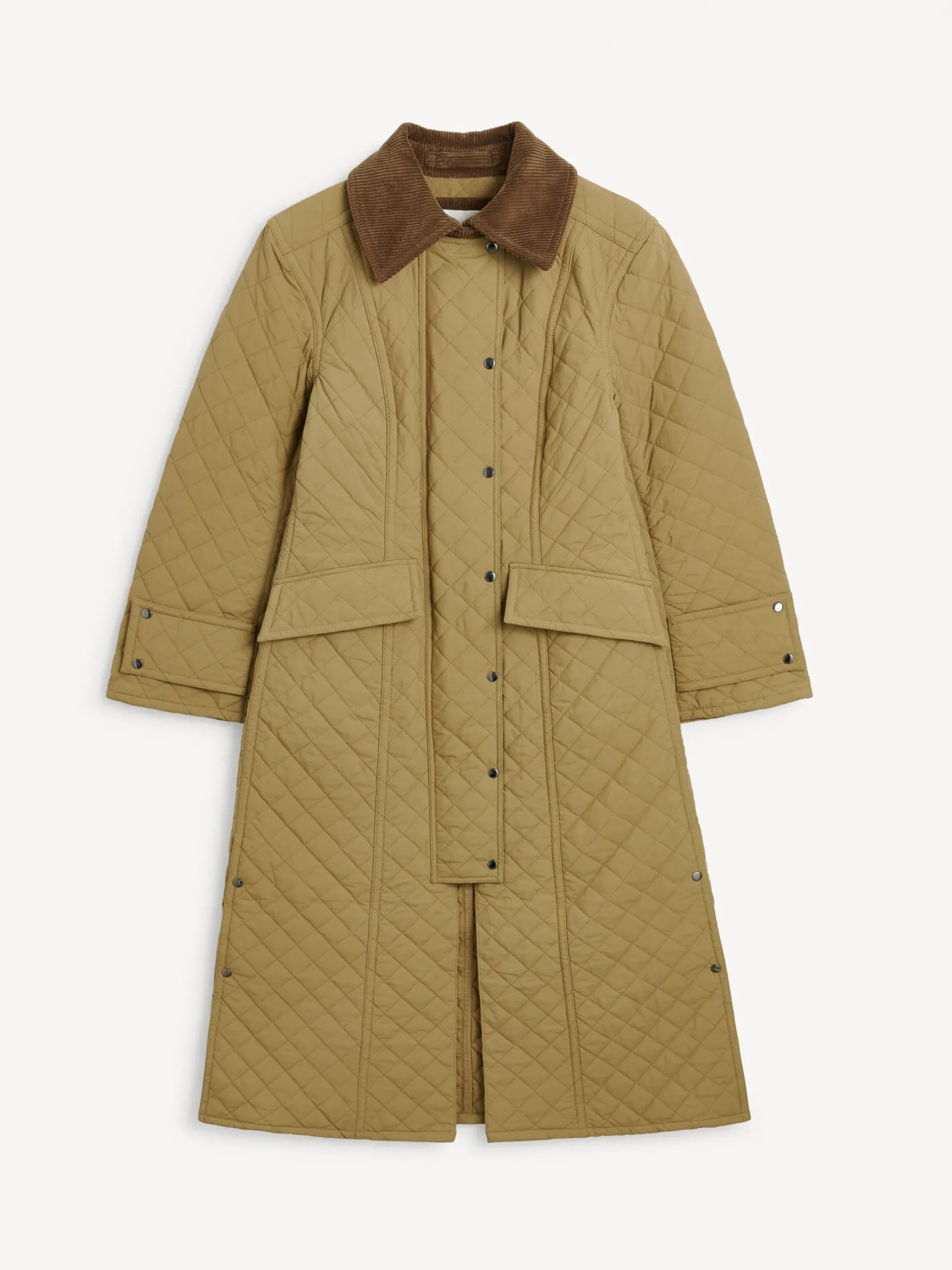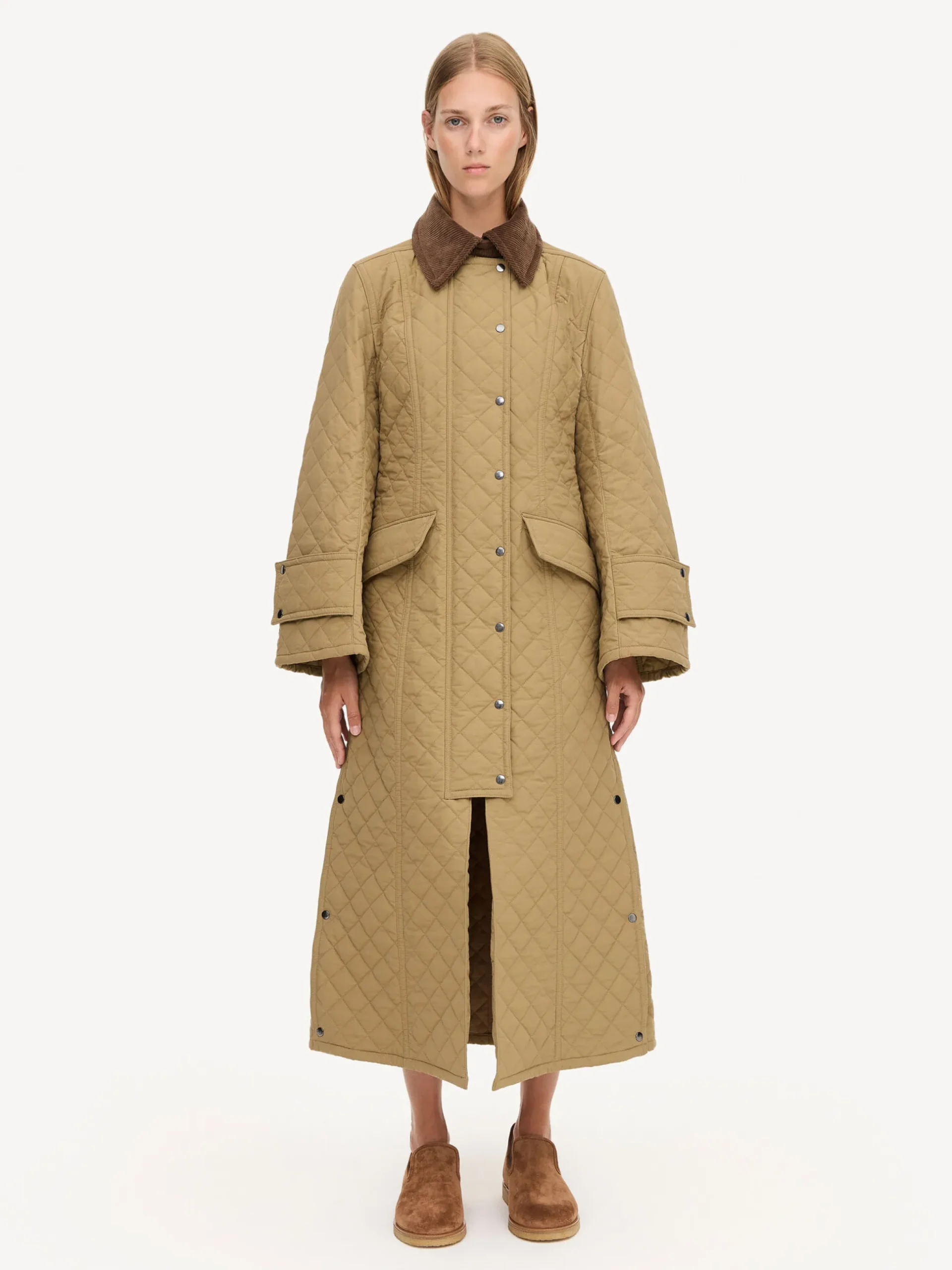 The Pinelope coat is a timeless rendition of a statement piece. It is shaped from a padded fabric to a sculpted silhouette with a cinch at the waist that is accented with a zipper, silver buttons, and flap pockets. Style it with a scarf for a transitional look.