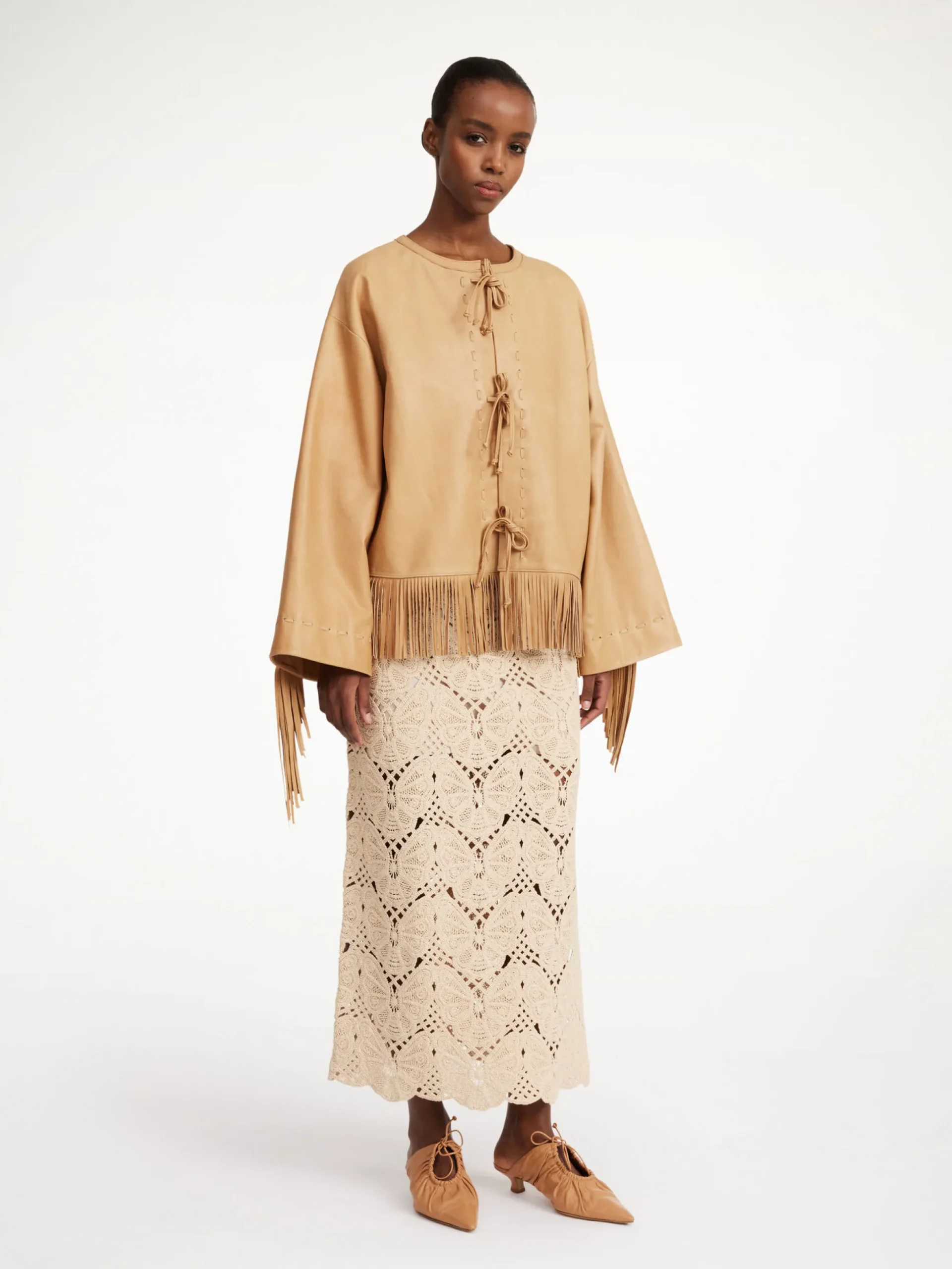 A leather jacket, such as the Zoena design, is an investment item that will only get better with time. Detailed with buttery soft leather fringes, bow fastenings and discreet side pockets, the silhouette makes a lasting impression. Underline the maximalist mood by pairing with the Coras leather skirt.