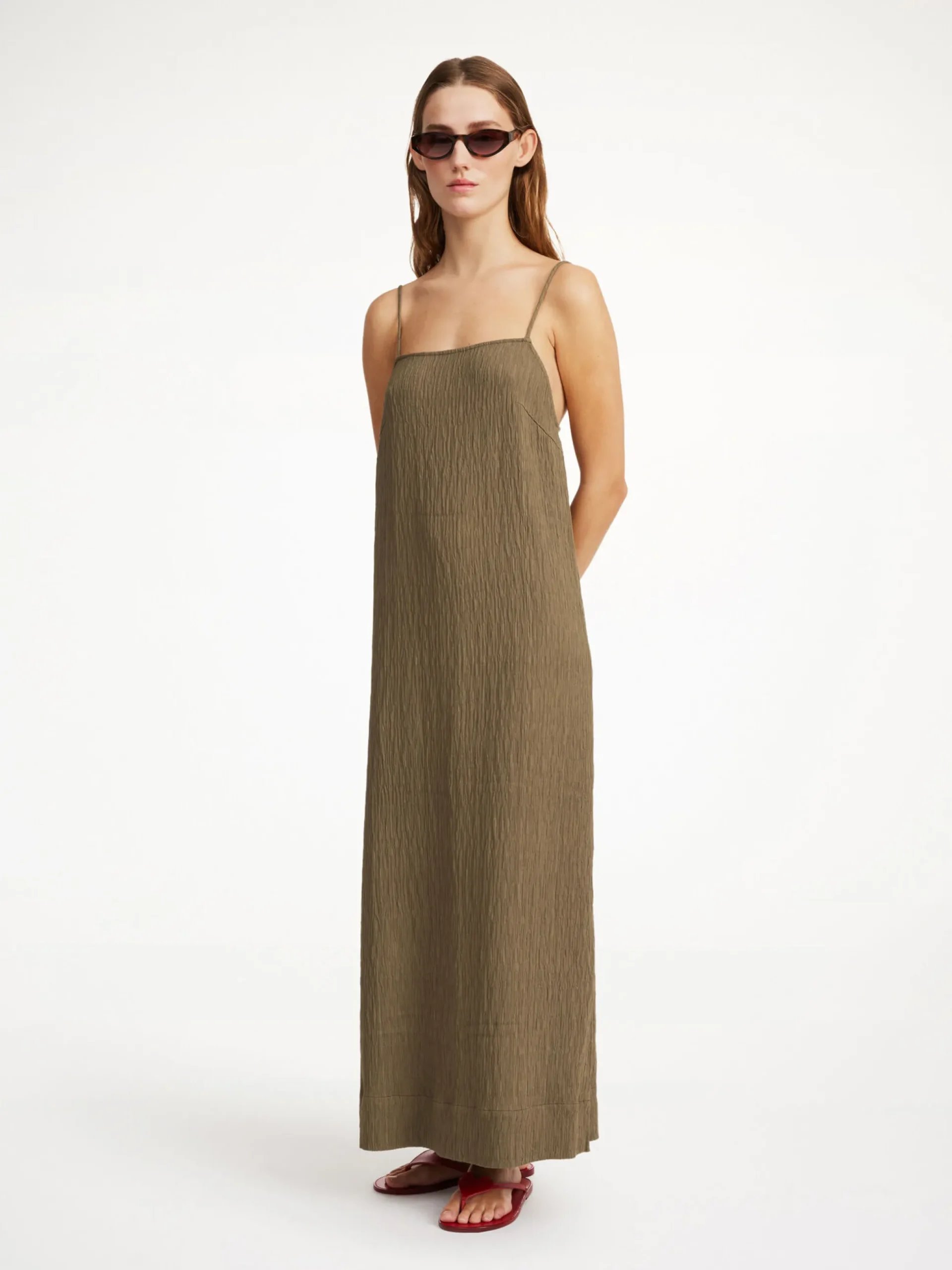 Slip right into the tactile Almeena dress. Easily adaptable to be worn wherever you go, the maxi silhouette simply features slender straps and a slit in the side.