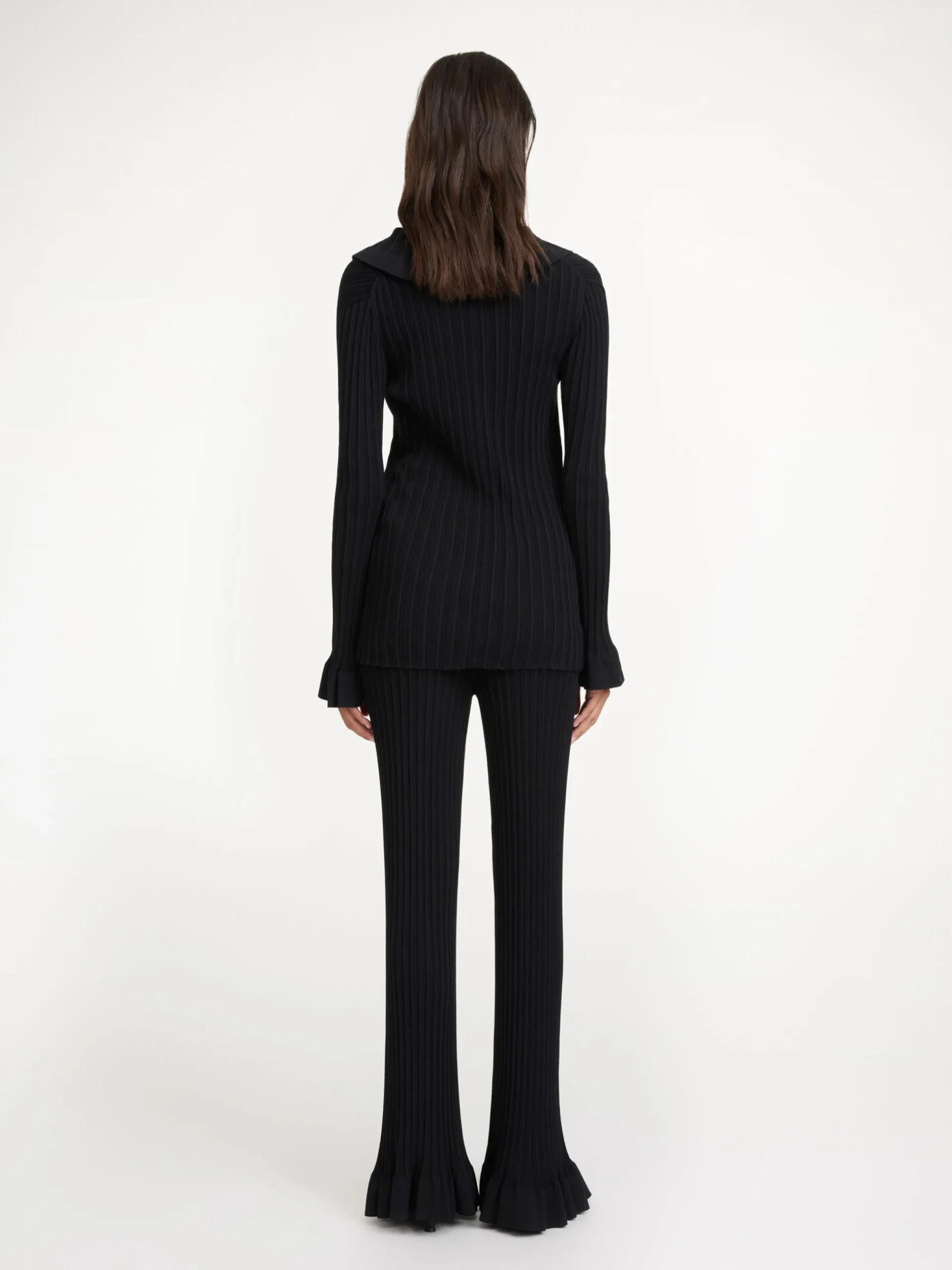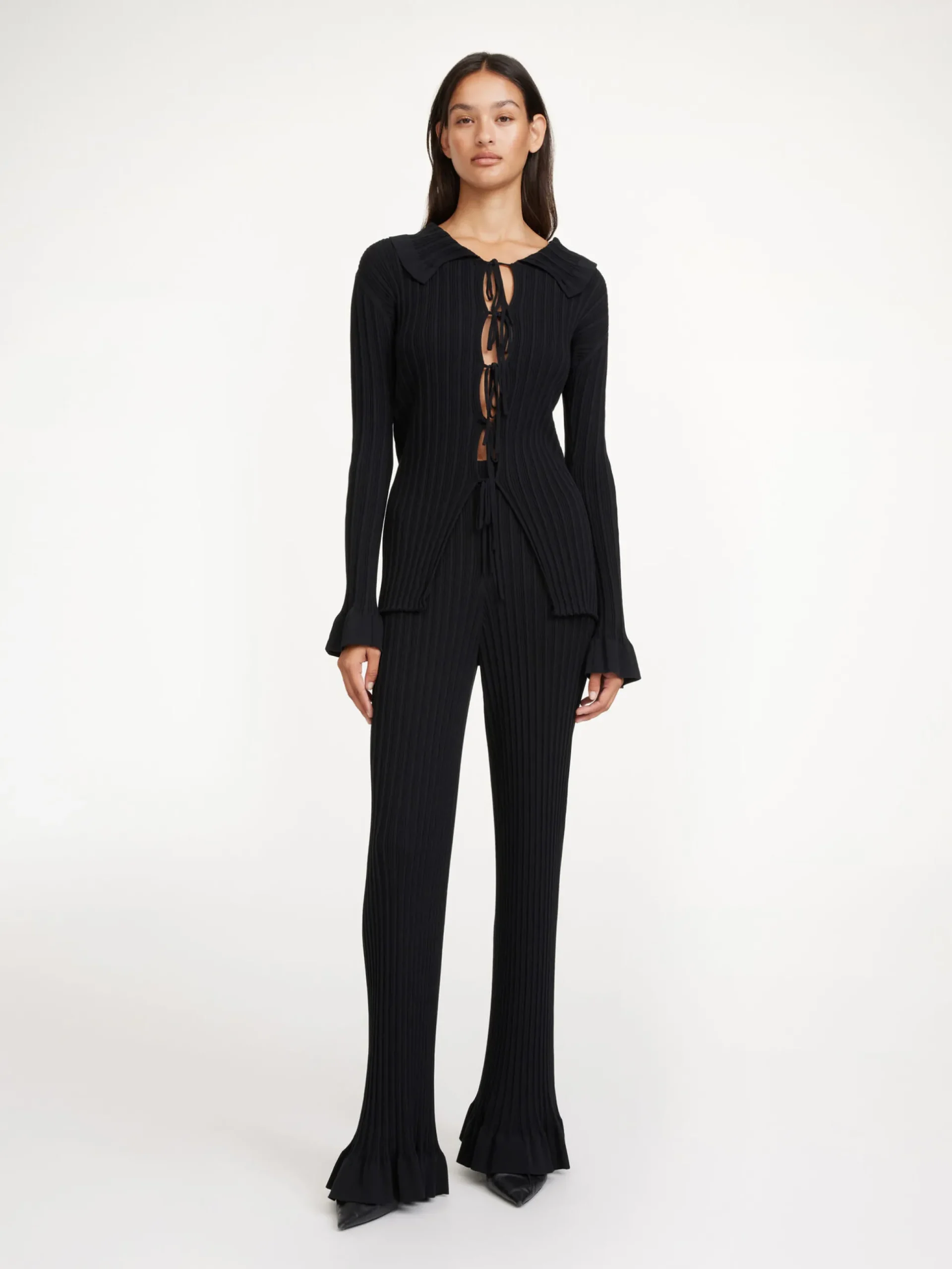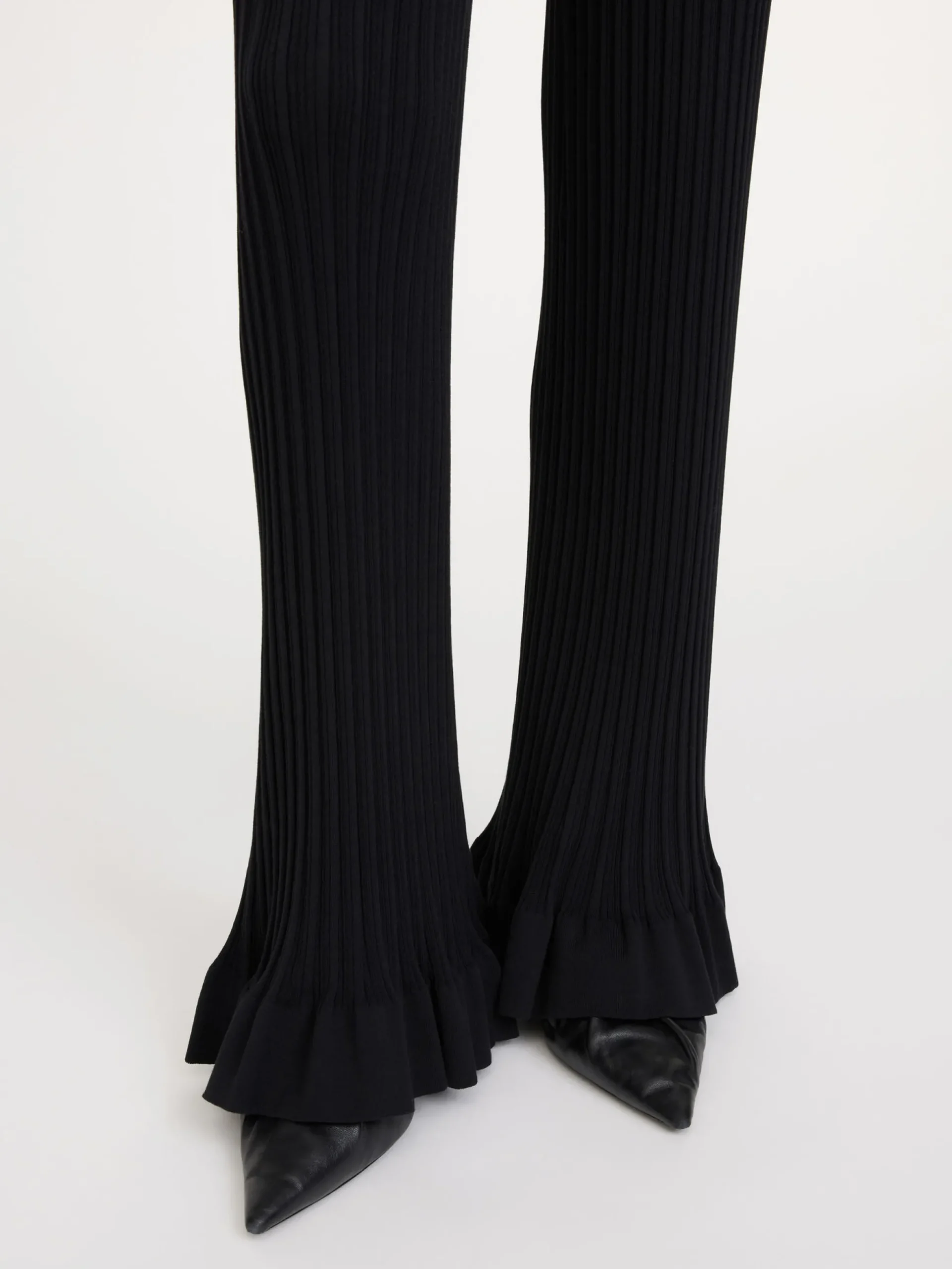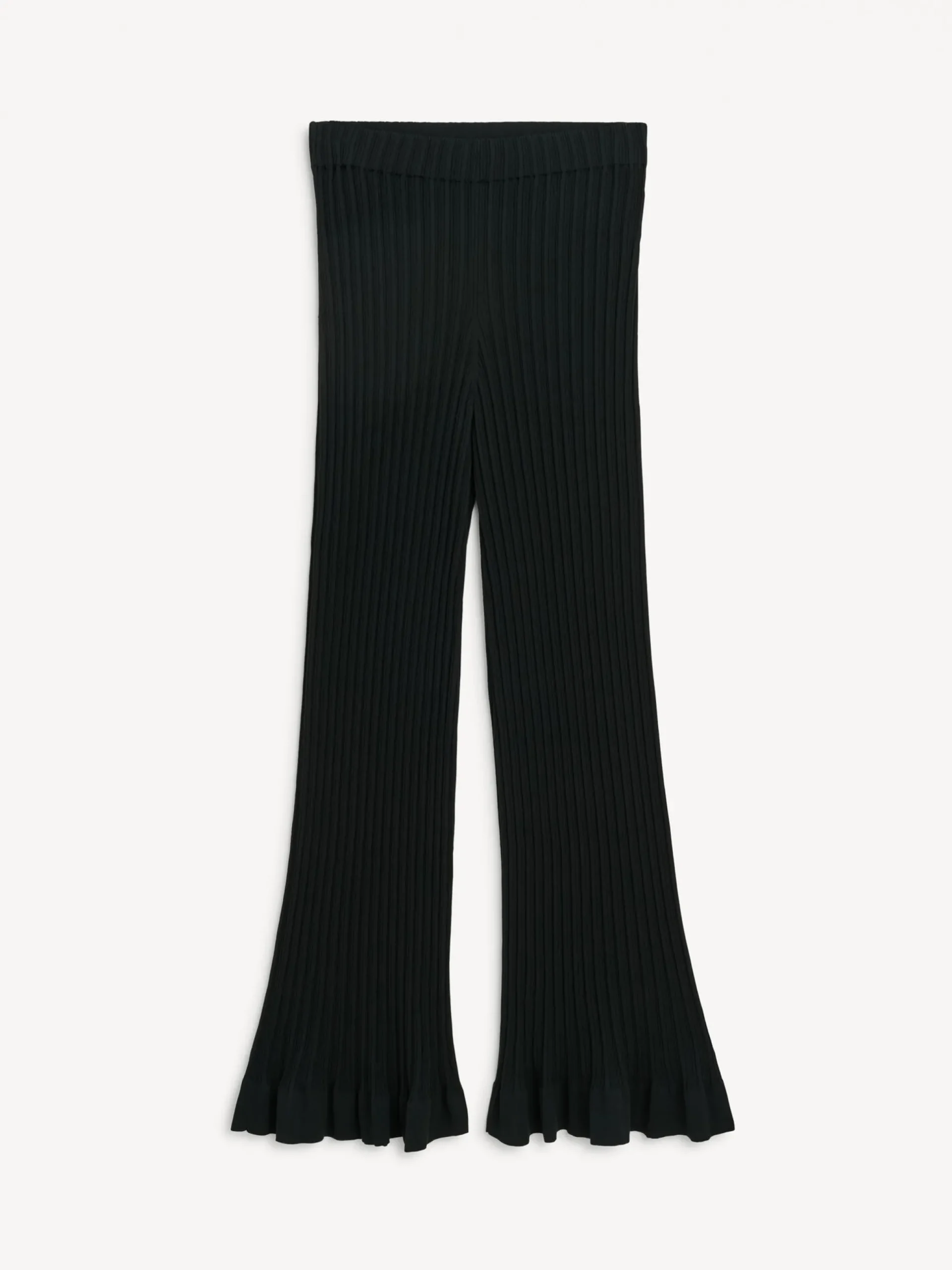 By Malene Birger Kenzie trousers knitted from an airy cotton blend. They have an elastic waist for comfort and a loose silhouette that falls to full length with frilled hems. Complete the look with the matching cardigan.