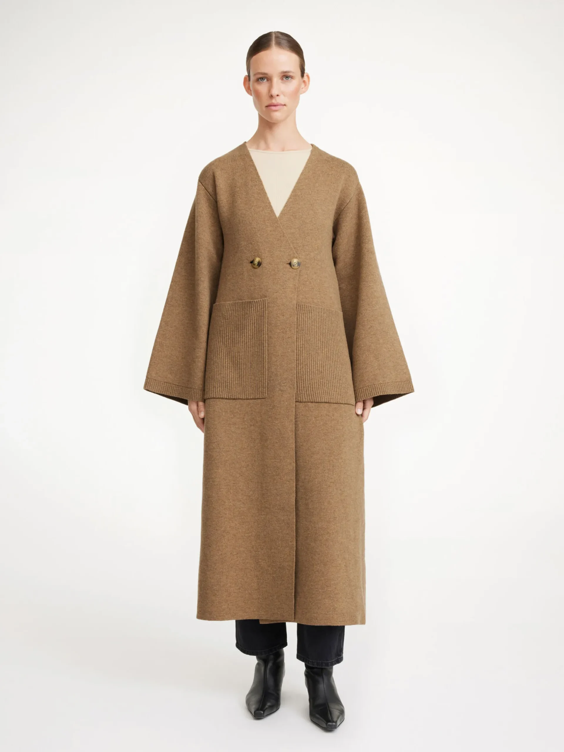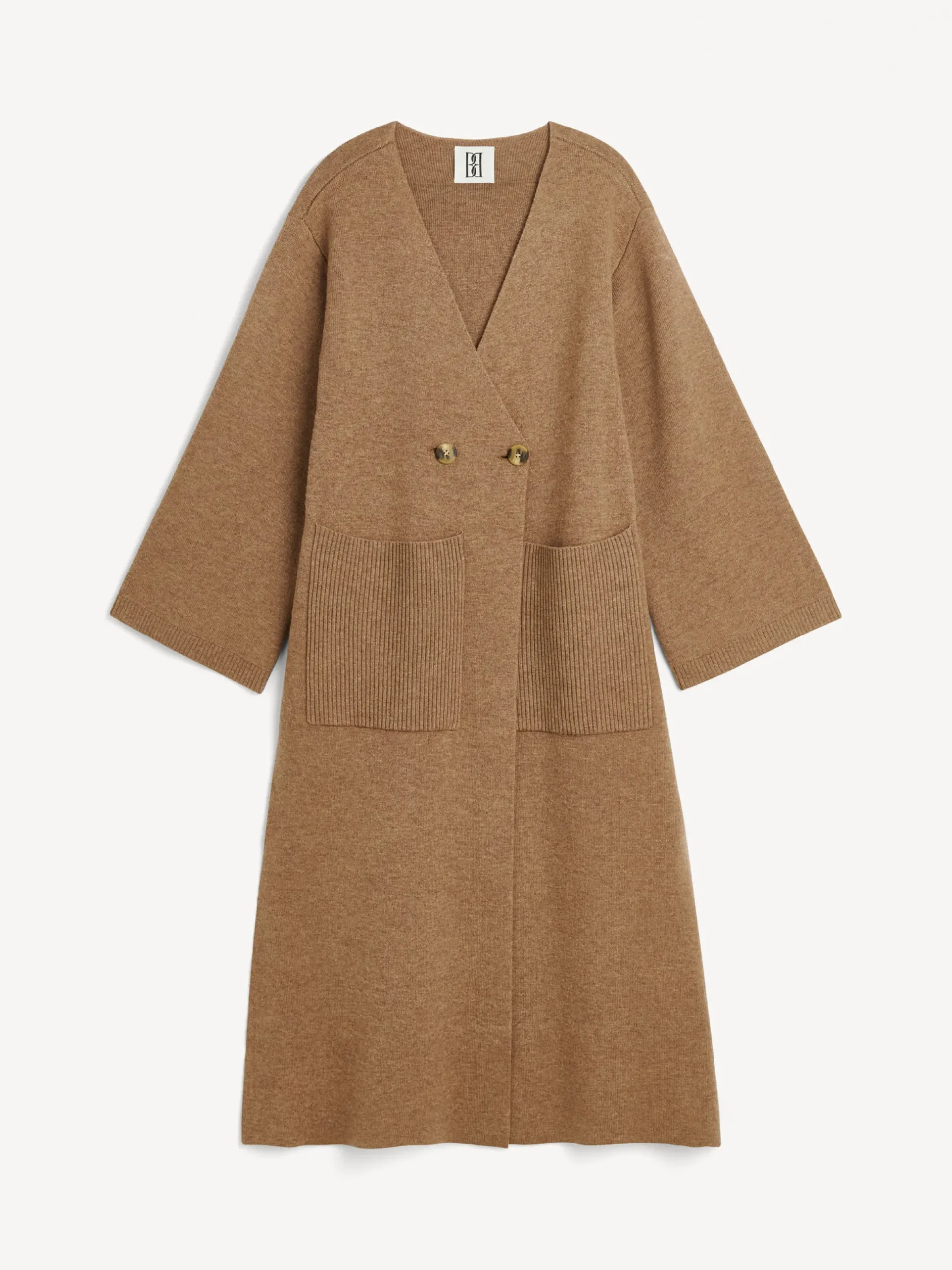 By Malene Birger Carlyn cardigan knitted from a stretchy wool blend. The double-breasted design is knitted to a regular fit with a plunging V-neckline, wide sleeves, and ribbed pockets. Wear it open or closed with leather trousers.