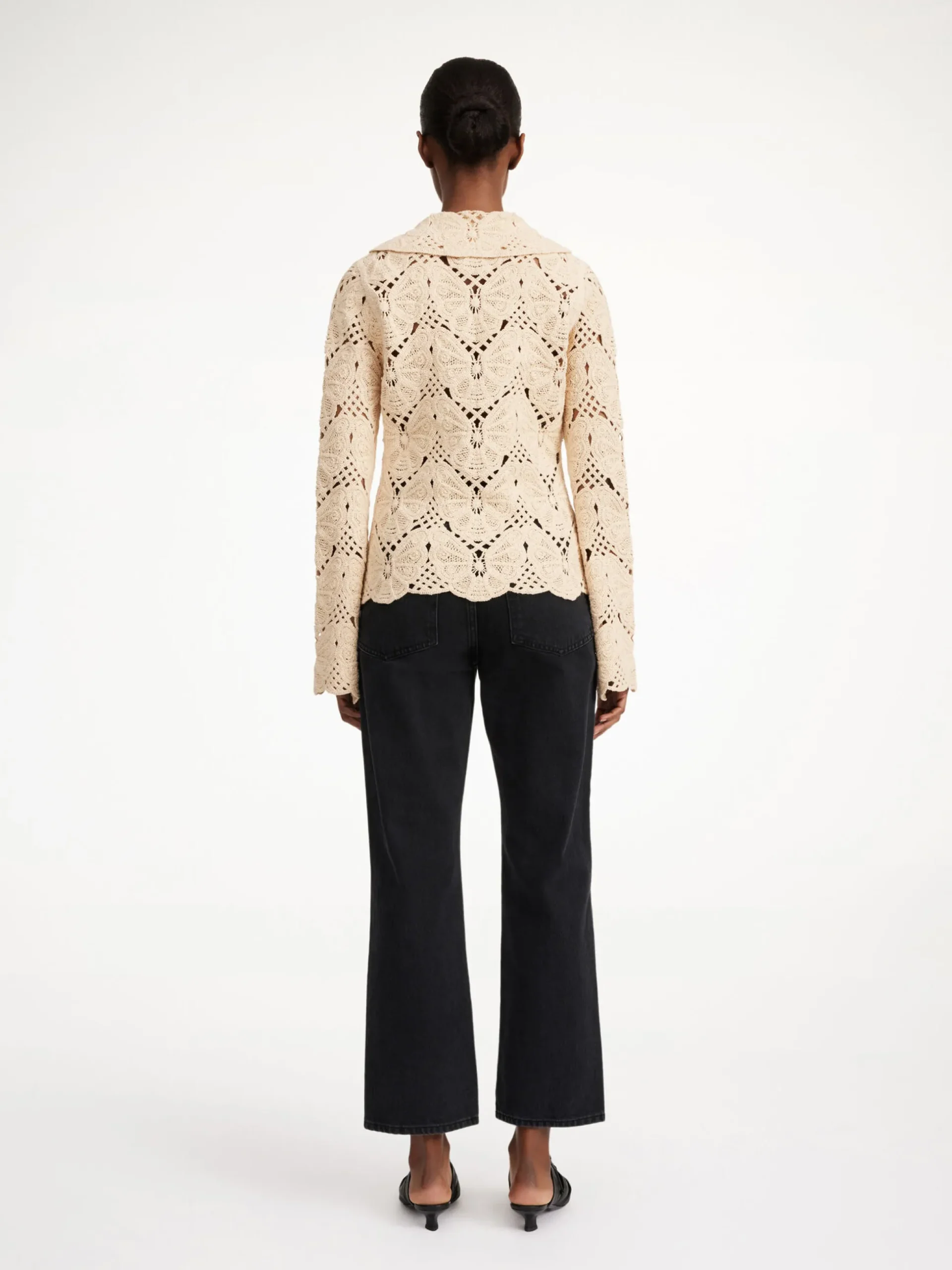 With a vintage-inspired vibe, the Gwenevere shirt is made in a distinctive butterfly crochet. Ultrafeminine, the delicate silhouette is detailed with a large, curved collar, elongated sleeves, and buttons down the front. Pair with the matching Cantala skirt or over the Falla dress.