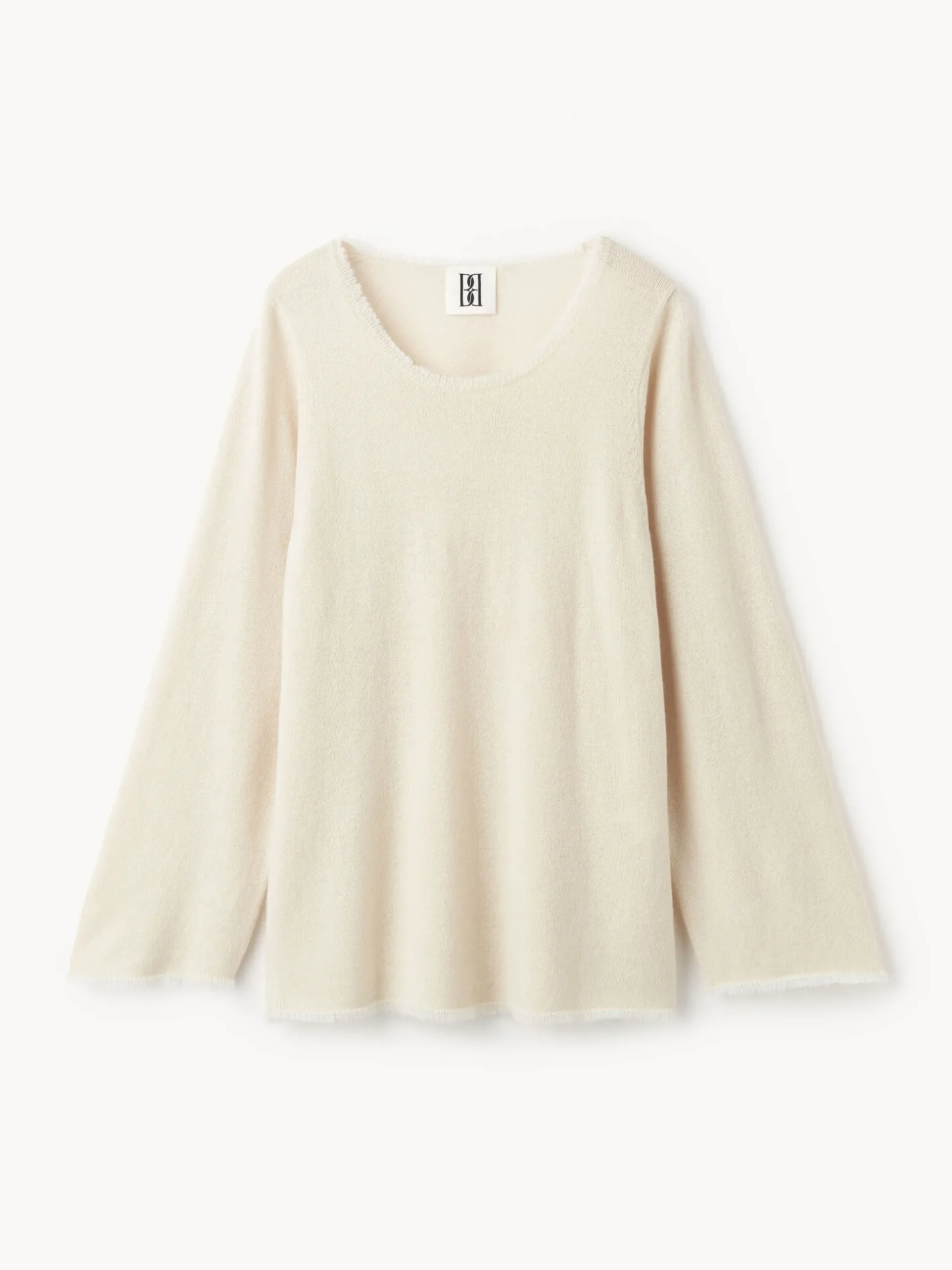 By Malene Birger Luise sweater knitted from merino wool and yak. It has a relaxed silhouette framed by a curved neckline and spacious long sleeves. Wear it with silk trousers and flats when working from home.