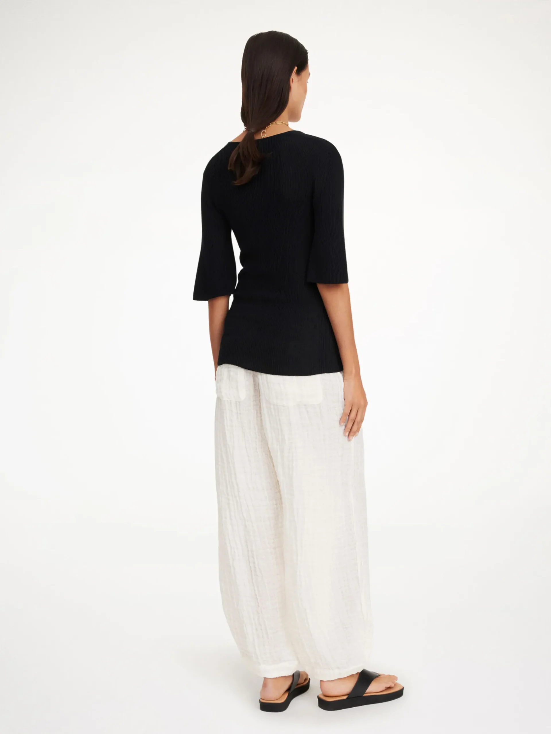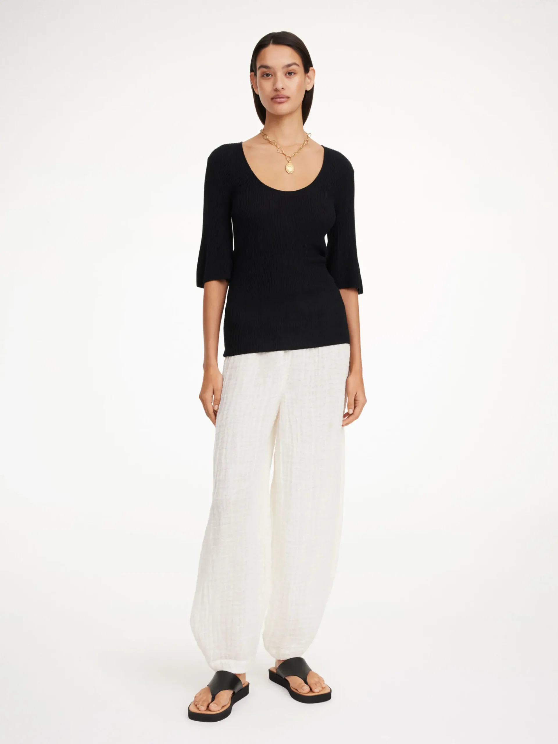 A versatile staple, this ribbed-knit top is minimally detailed with cropped sleeves and a wide neckline. Layer yours under a blazer or tuck into jeans.