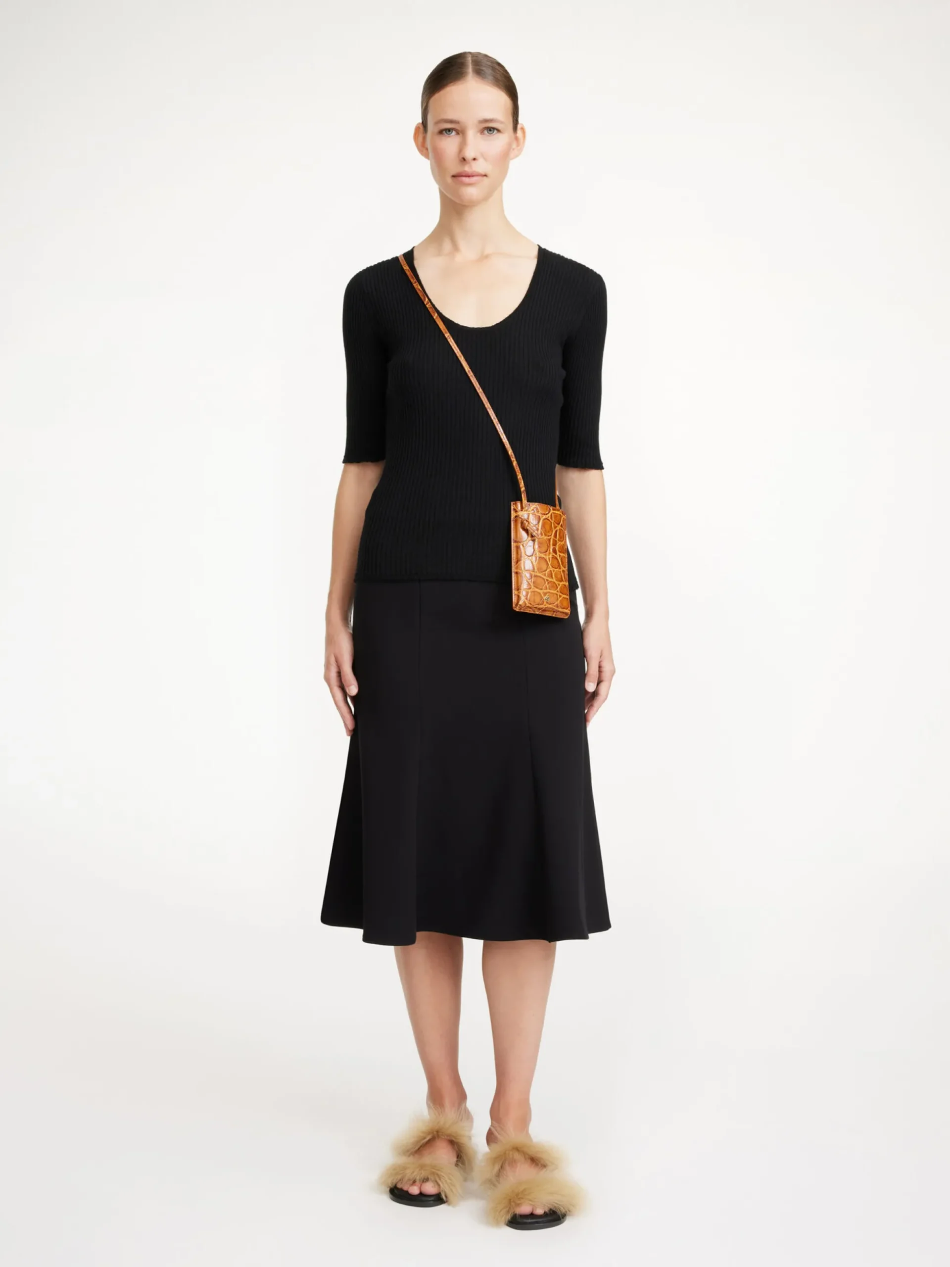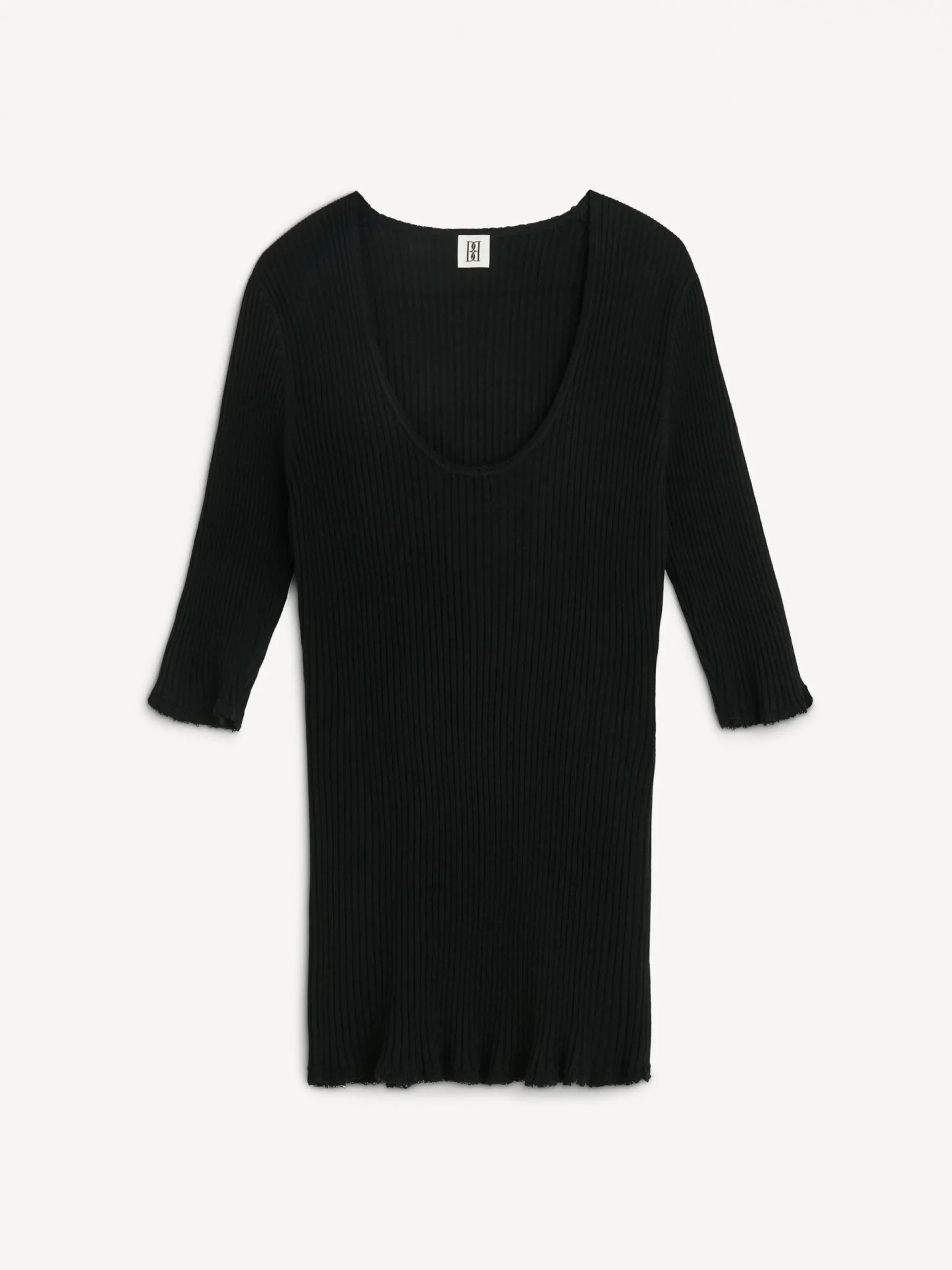By Malene Birger Remoni top knitted from thin merino wool that is soft to the touch. It has a minimalist slim silhouette with a round neckline and above-the-elbow sleeves. Tuck it into jeans or wide-leg trousers for an easy office day.
