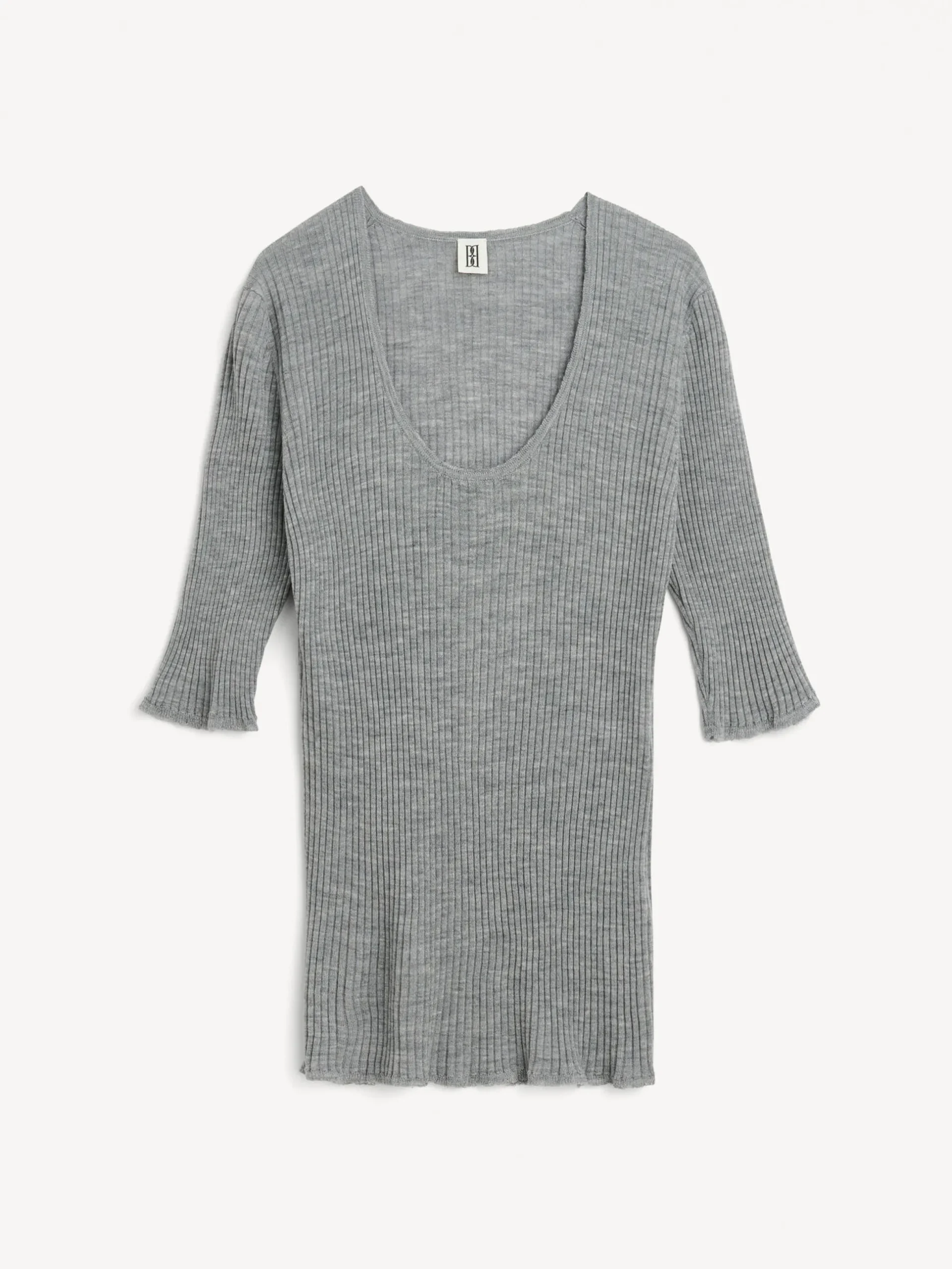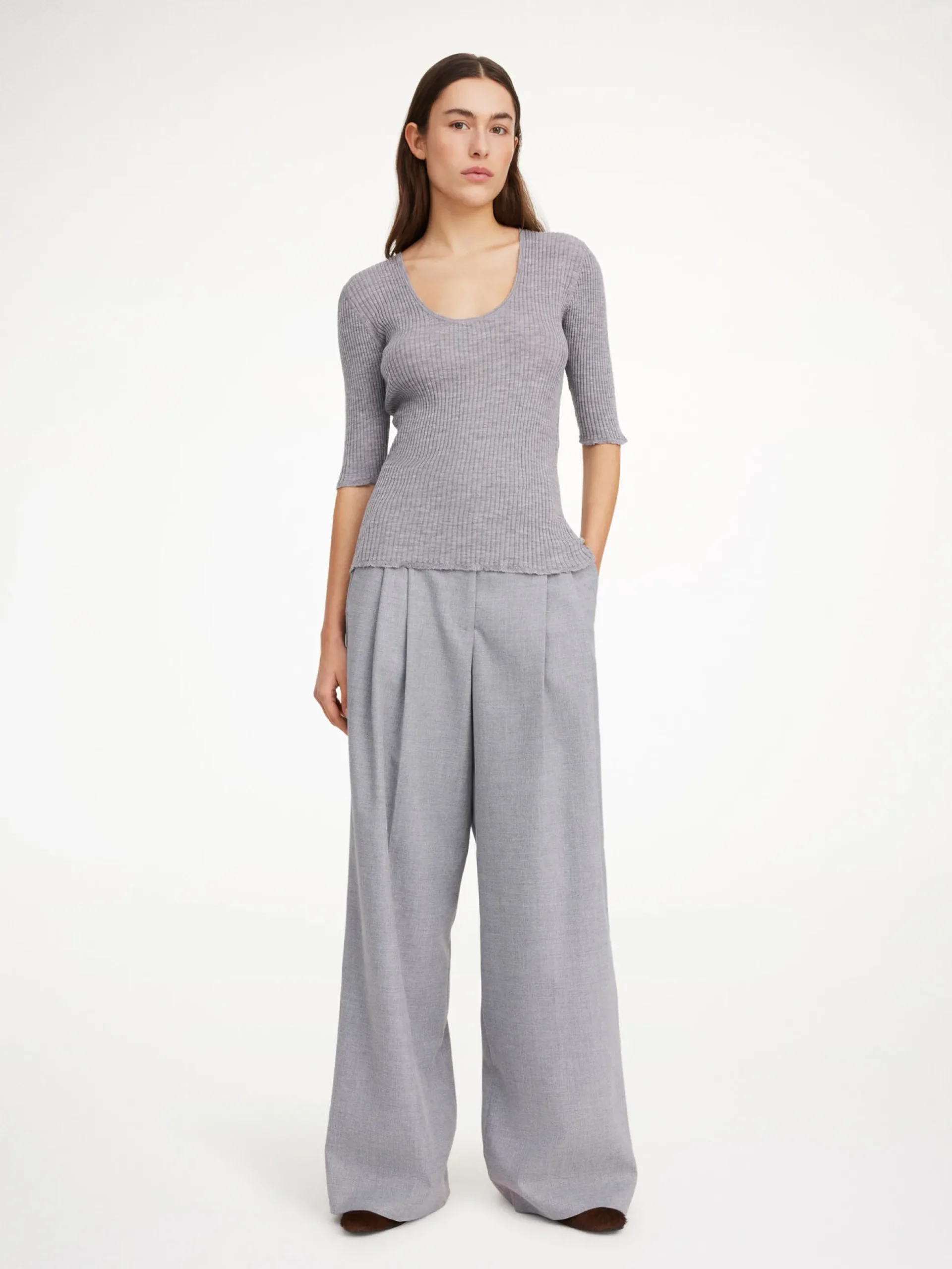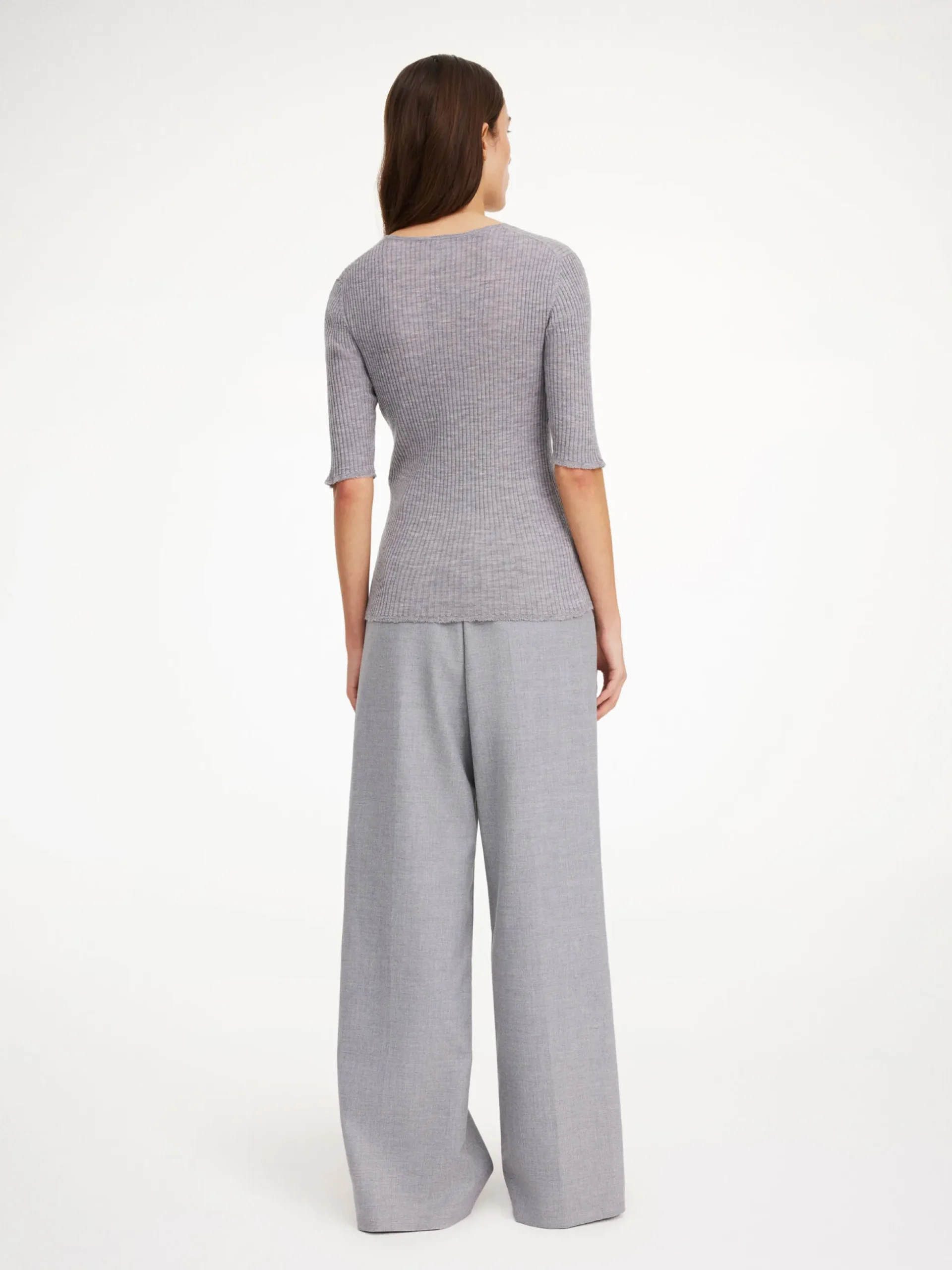 By Malene Birger Remoni top knitted from thin merino wool that is soft to the touch. It has a minimalist slim silhouette with a round neckline and above-the-elbow sleeves. Tuck it into jeans or wide-leg trousers for an easy office day.