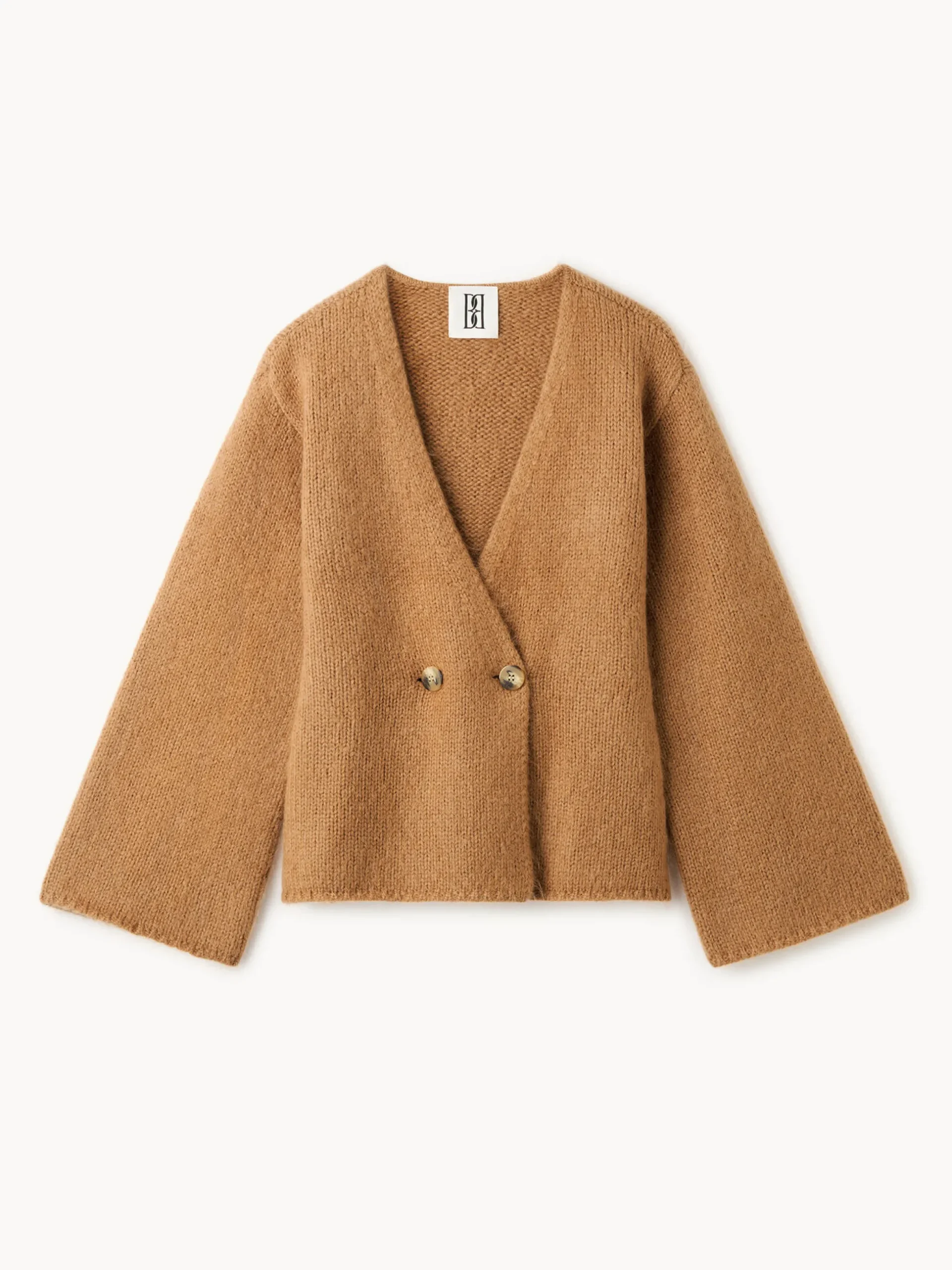 Nipped in at the waist and defined with double-breasted button fastenings to frame your curves, the Tinley cardigan is spun from a blend wool and mohair with a hint of stretch for comfort and flexibility. Generous sleeves and a deep V neckline underpin its relaxed feel. Wear yours over the season’s wide-leg trousers.