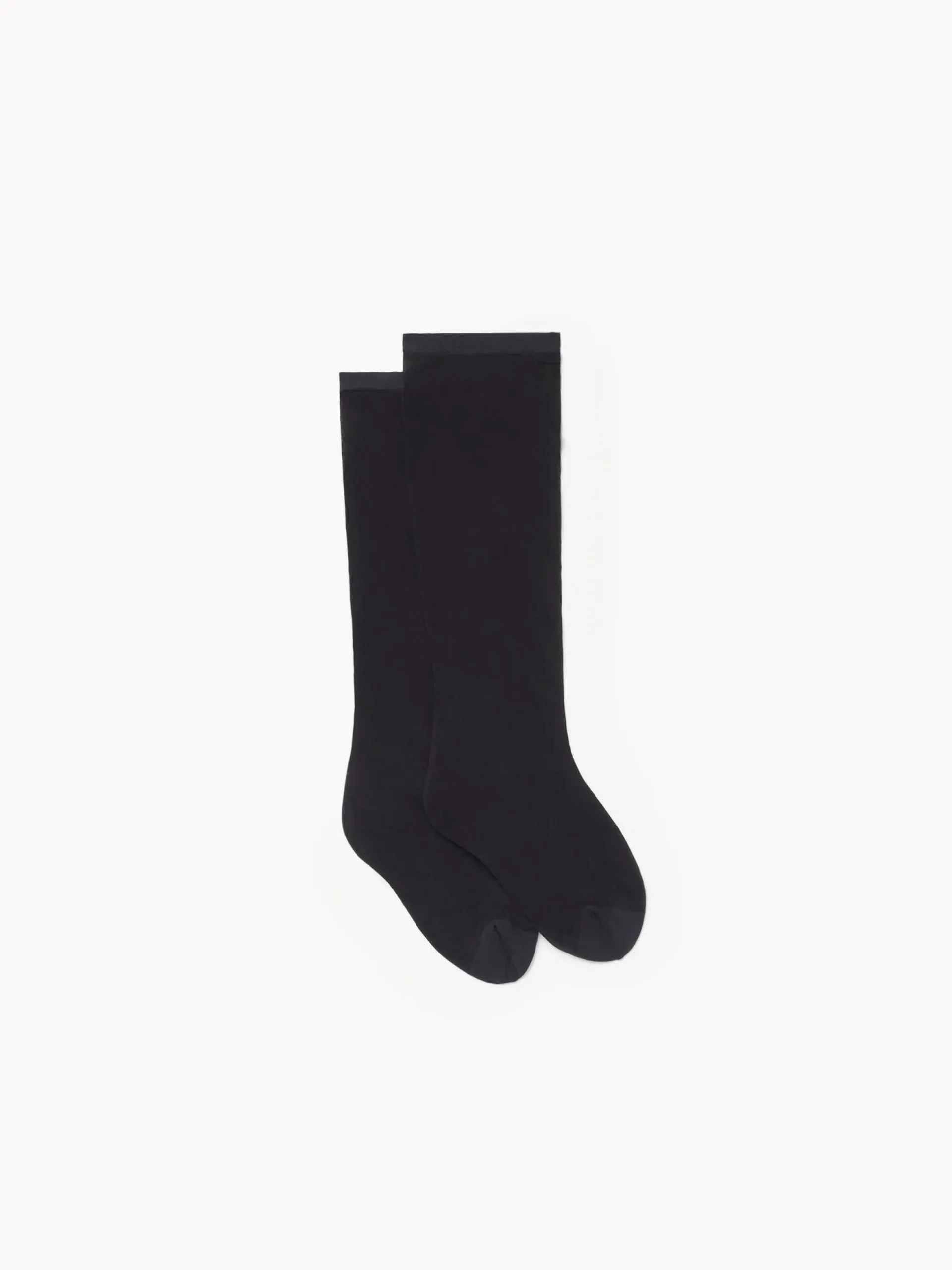 By Malene Birger Nylah socks knitted from a smooth fabric blend. They are designed with a thin cuff and a prominent monogram. Wear them with jeans and heeled mules to the office.