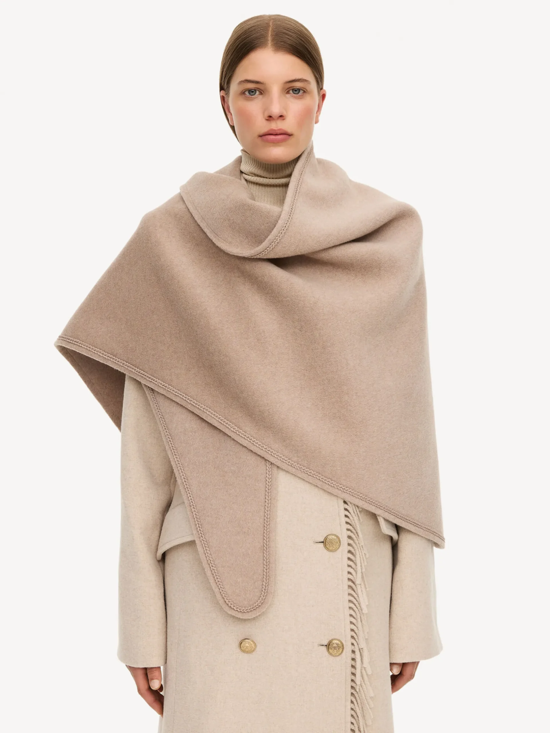 By Malene Birger Scarpenna scarf cut from luxurious wool. It features a triangular silhouette and a contrasting hemline. Drape it over a wool coat throughout the season.