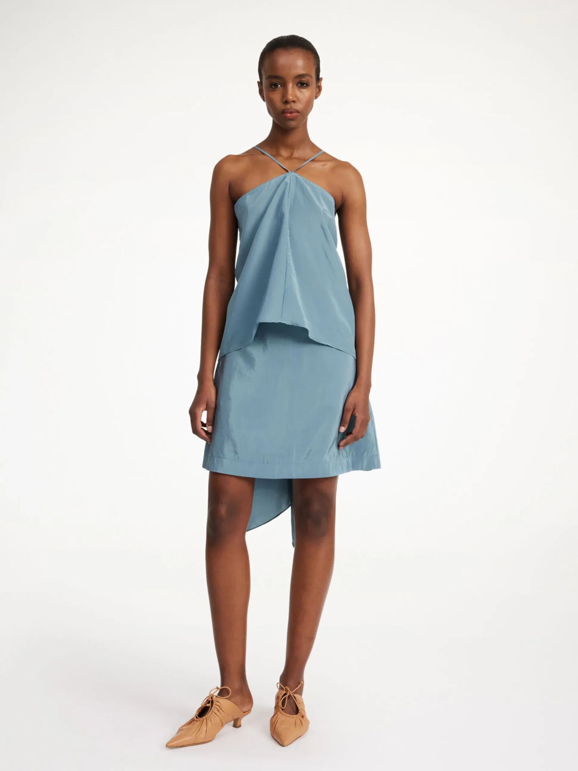 A fitted upper contrasted with flowing elements that fall gently down the back lend a refined expression to the Brinola …