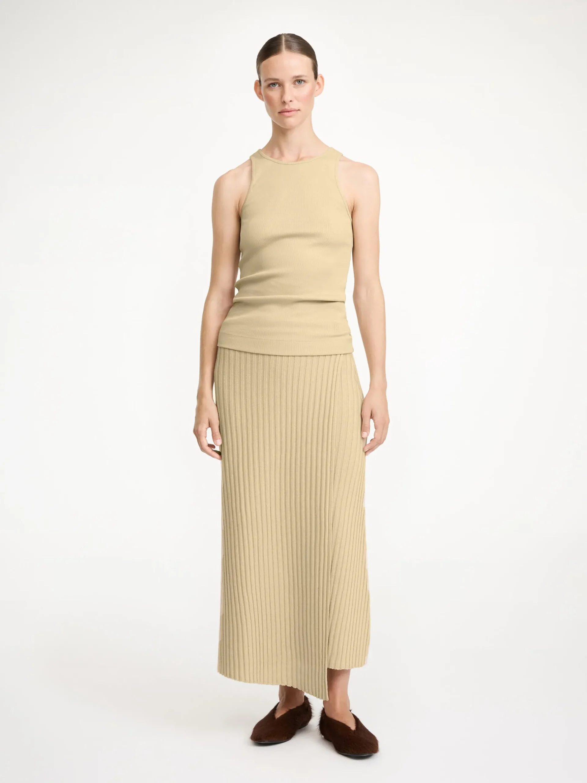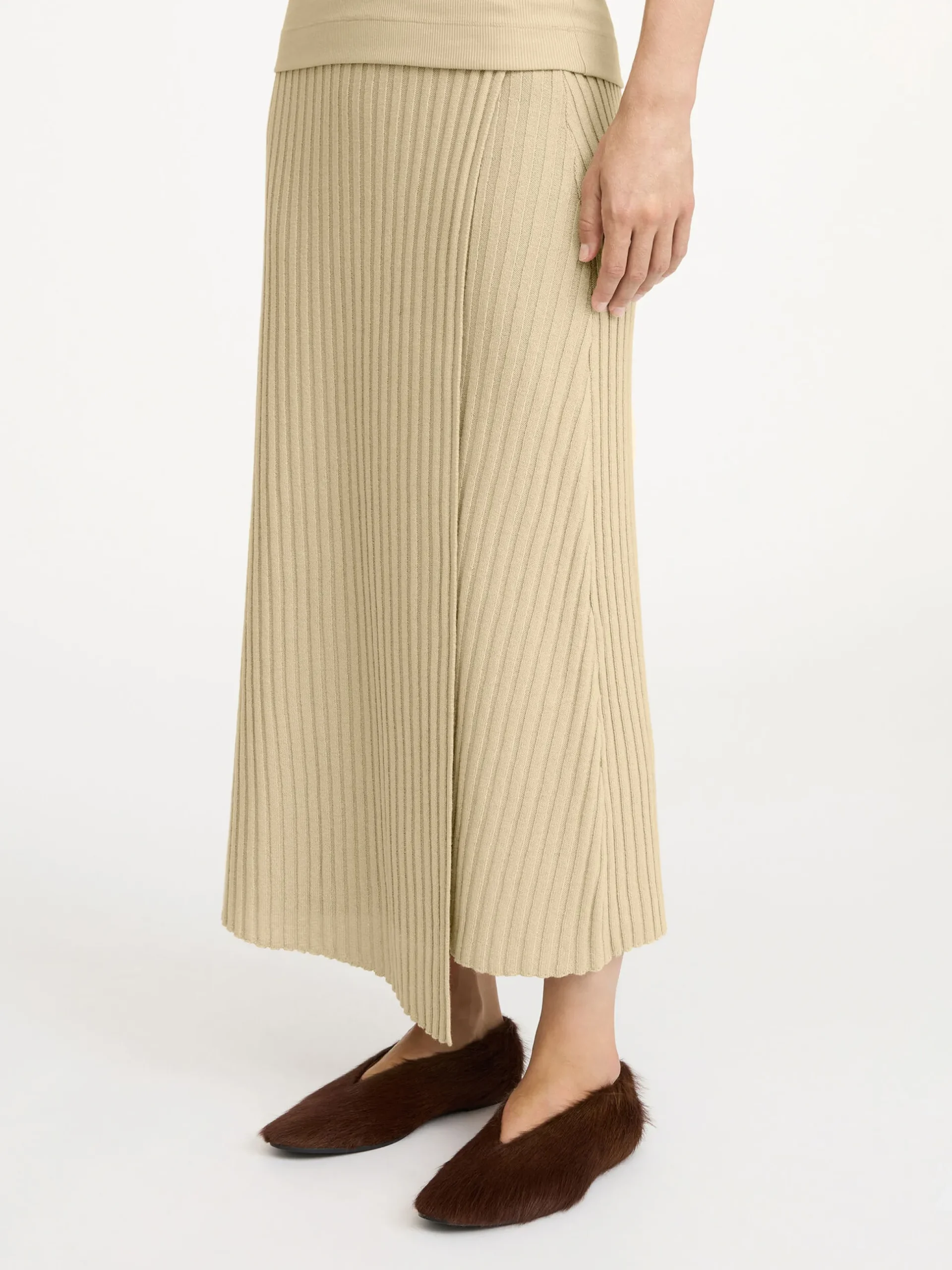 Cassila midi skirt knitted from merino wool to a regular fit. It is designed with an elastic waistband and an overlapping wrap design. Add a poncho and brooch to add a bohemian feel.