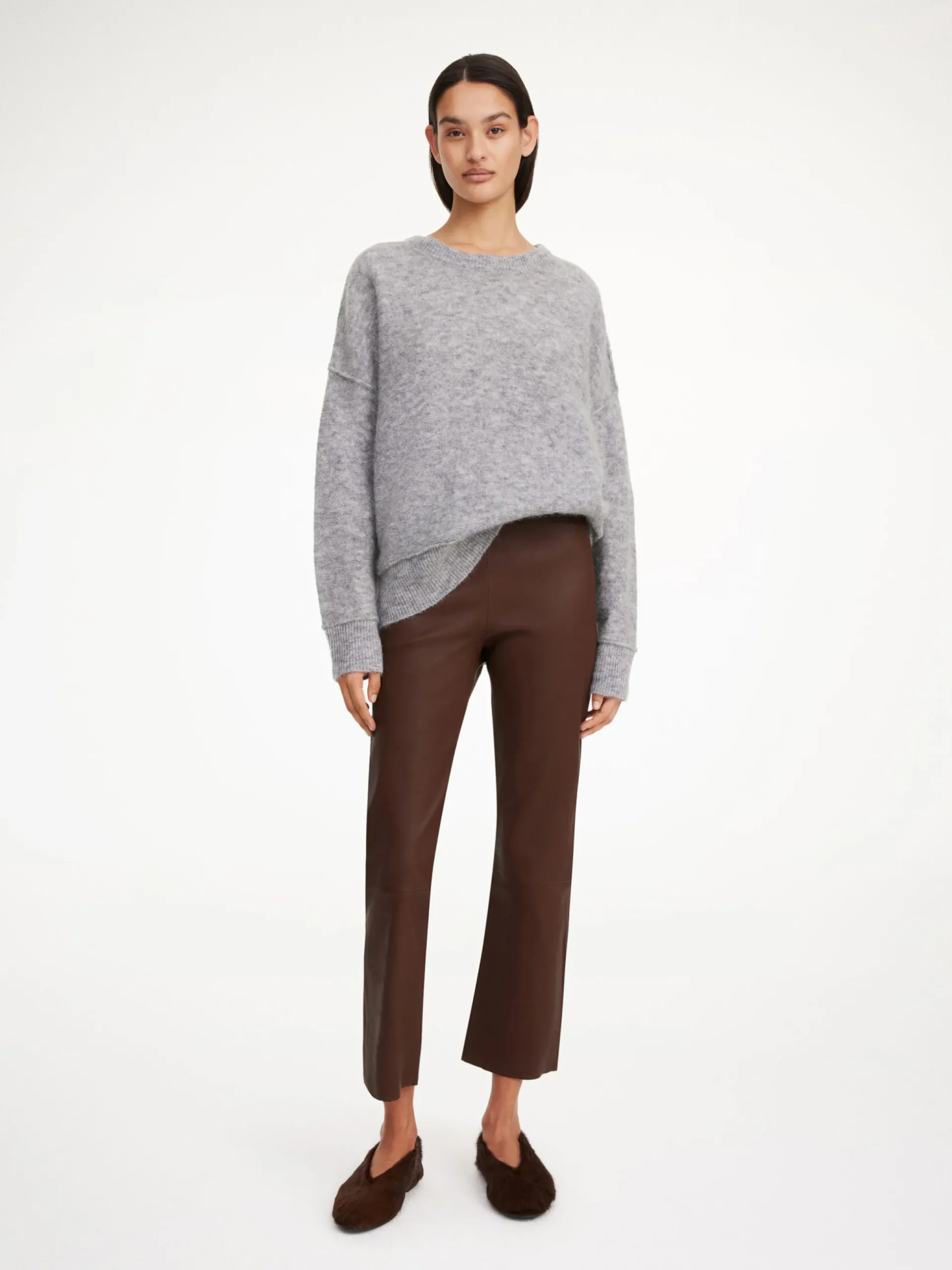 Cropped at the ankle and set on a flexible, elasticated waist, these leather trousers have universally flattering straight legs. They have pressed seams down the front and sit mid waist. Wear yours with everything from shirts to knitwear.