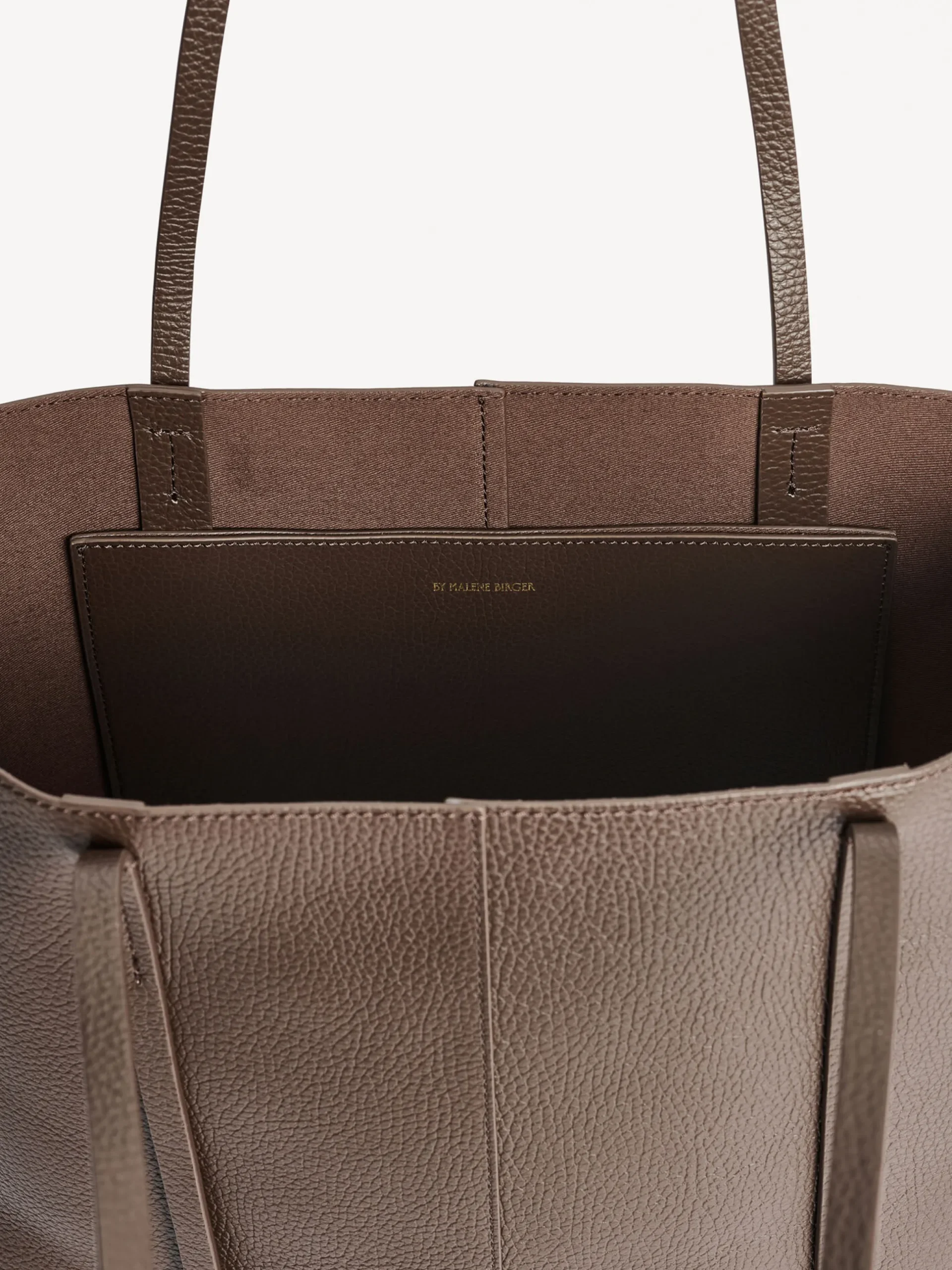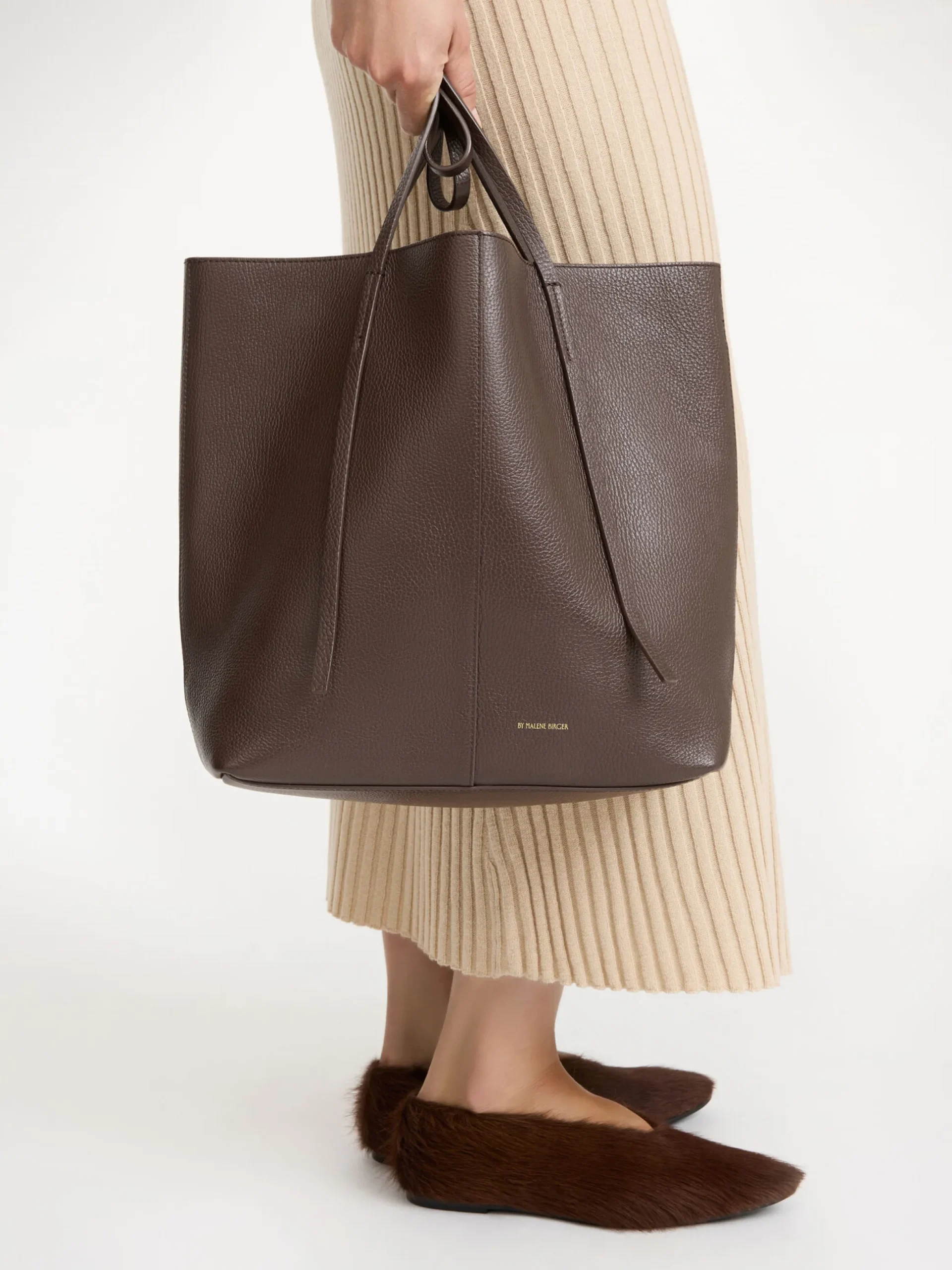 By Malene Birger Abilso bag cut from soft leather to a classic square tote silhouette. The slim tonal top handles and golden lettering accentuate a timeless character. Style it with office and weekend looks.