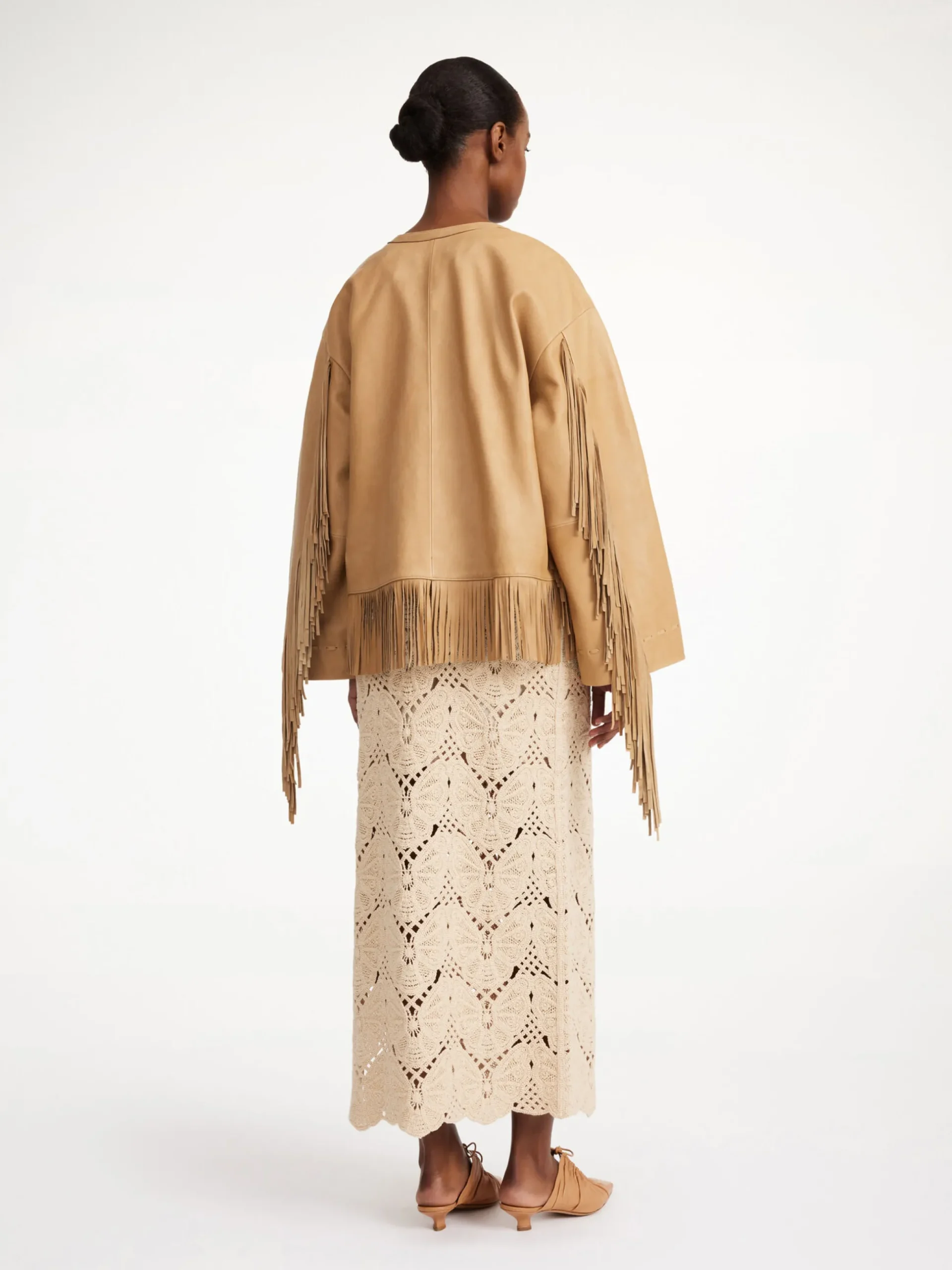 A leather jacket, such as the Zoena design, is an investment item that will only get better with time. Detailed with buttery soft leather fringes, bow fastenings and discreet side pockets, the silhouette makes a lasting impression. Underline the maximalist mood by pairing with the Coras leather skirt.