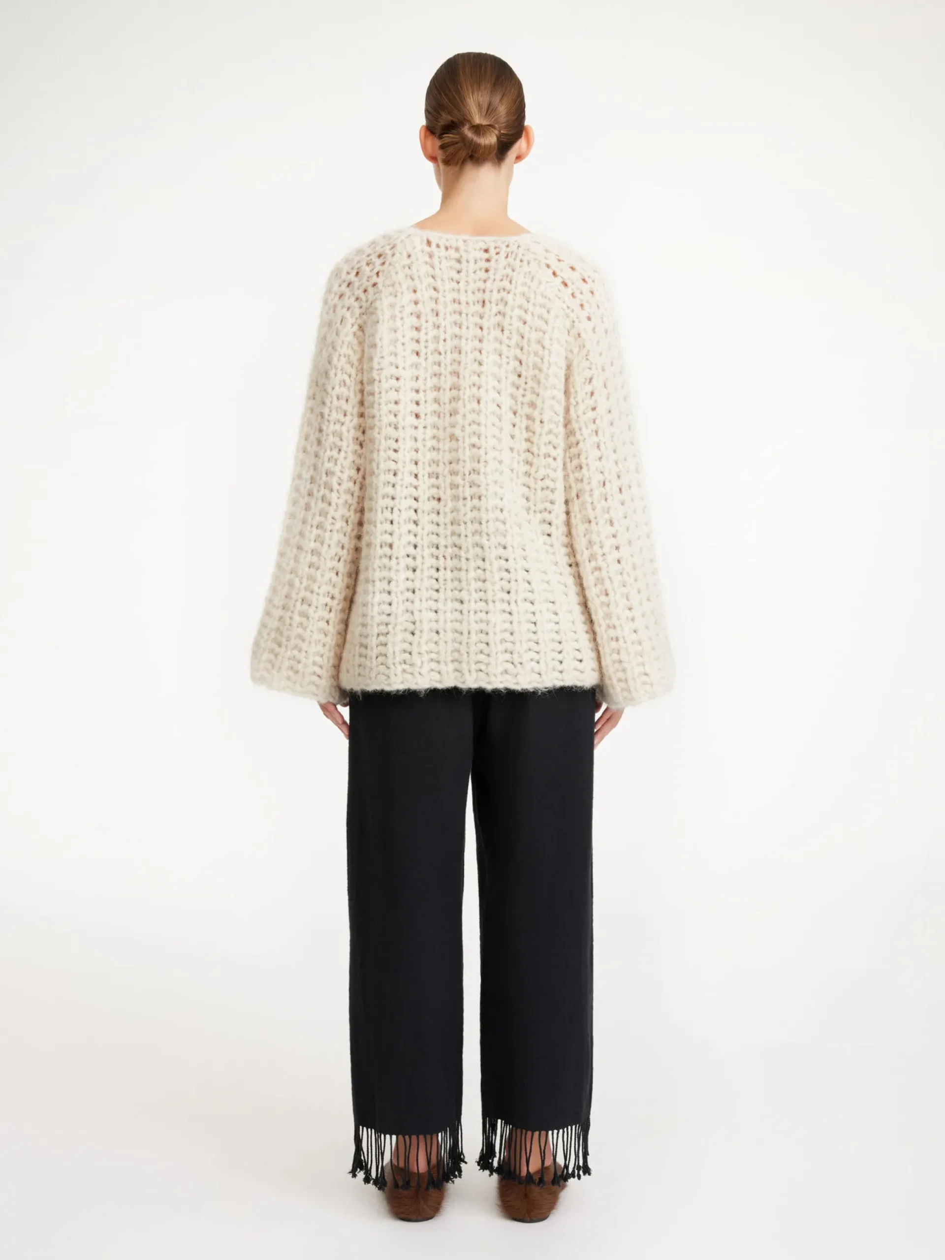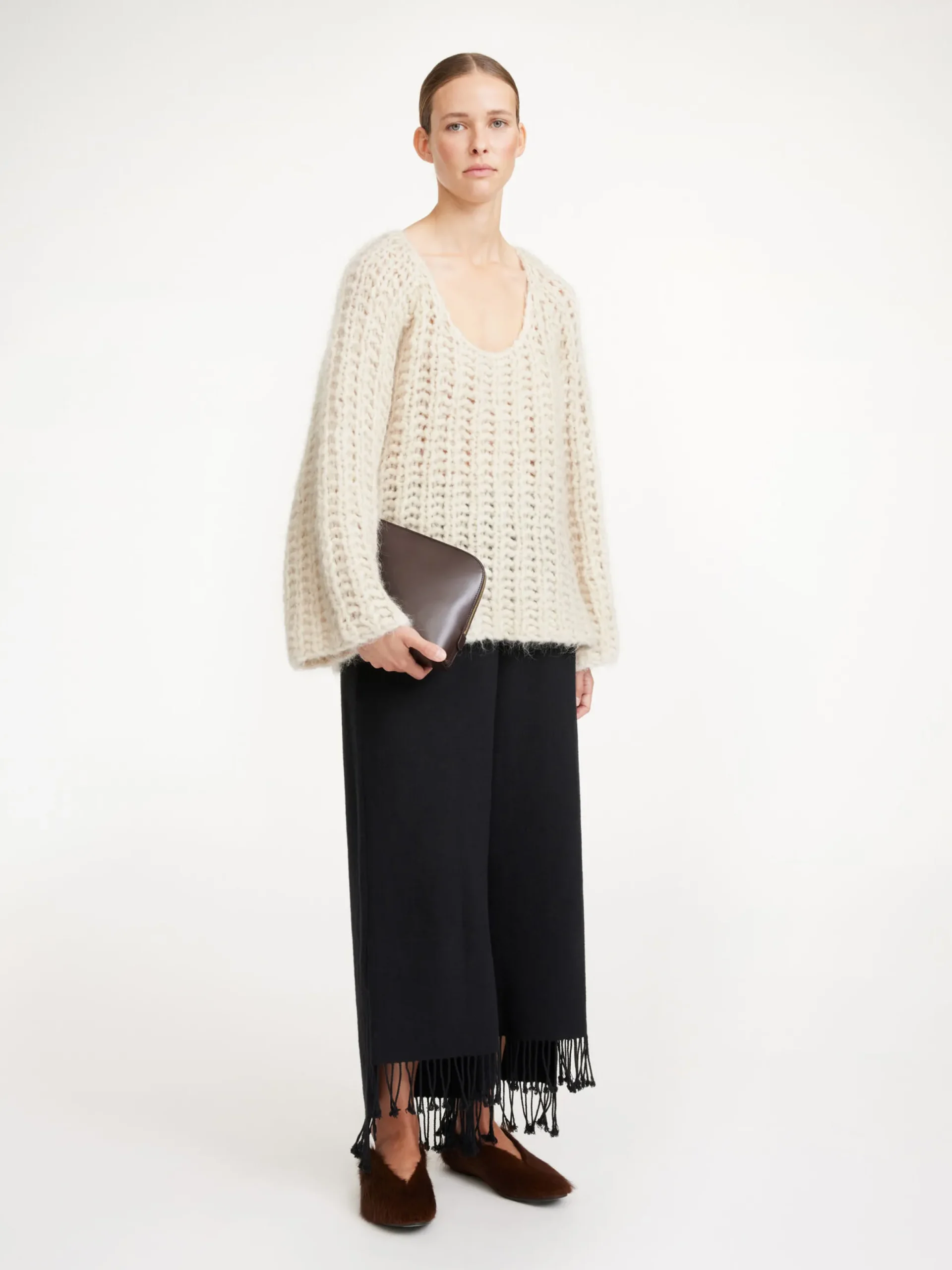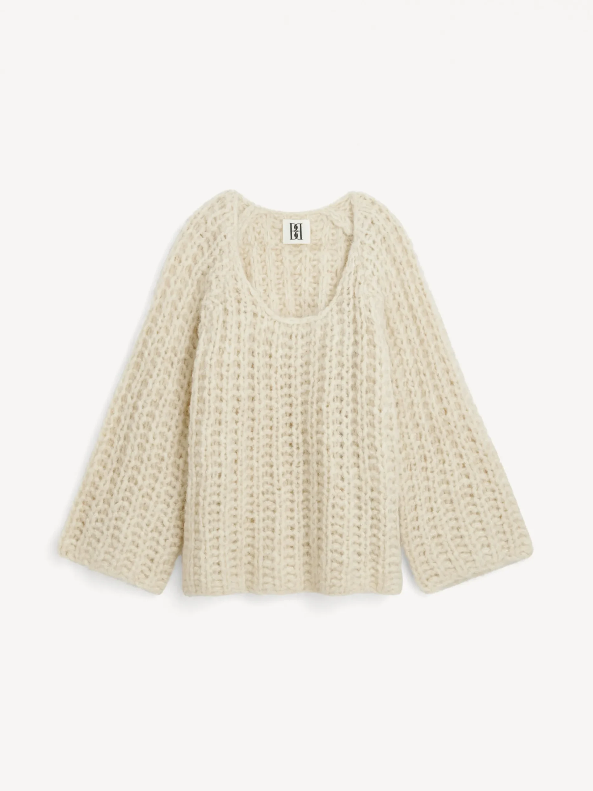 By Malene Birger Amilea sweater knitted from a soft alpaca and wool mix. It features a loose A-line silhouette, wide sleeves, and a curved neckline. Wear it with a midi skirt and tights on cold winter days.