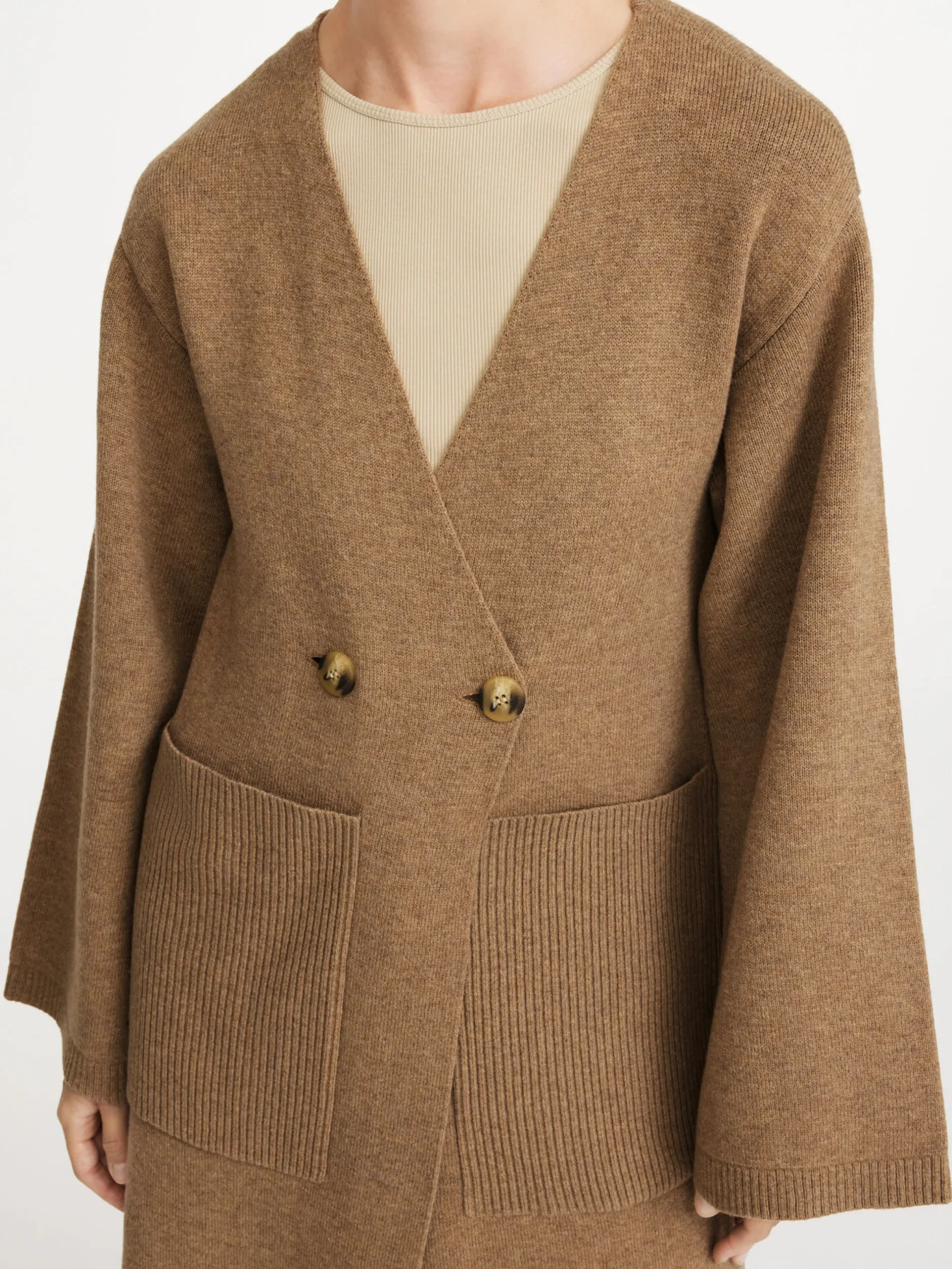 By Malene Birger Carlyn cardigan knitted from a stretchy wool blend. The double-breasted design is knitted to a regular fit with a plunging V-neckline, wide sleeves, and ribbed pockets. Wear it open or closed with leather trousers.