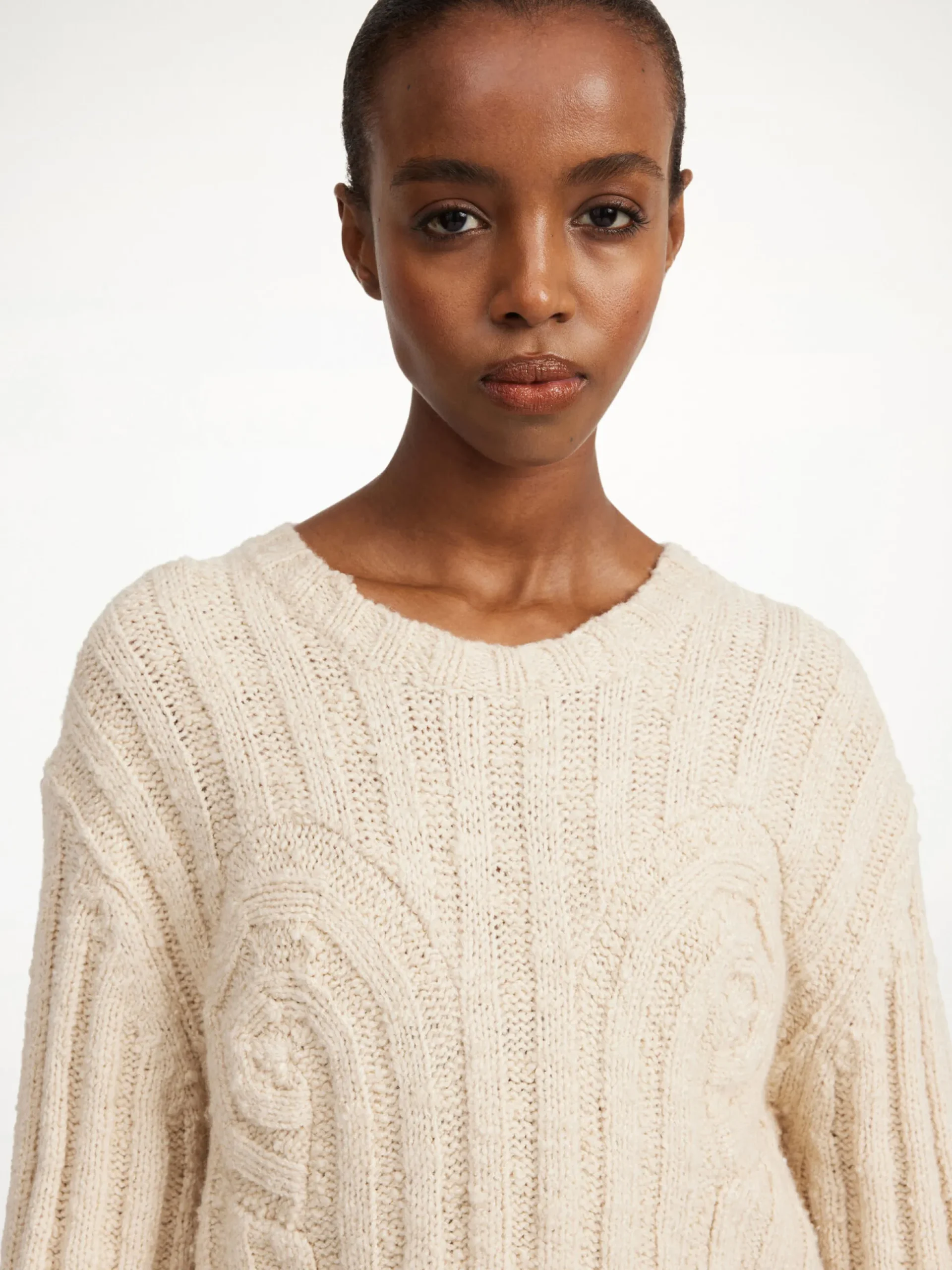 Equal parts cosy and cool, the Cirra sweater is designed in a cream slub-yarn and has feminine swirling details at the chest. Wear the slouchy, boyish silhouette over everything from dresses to tailored trousers and jeans.
