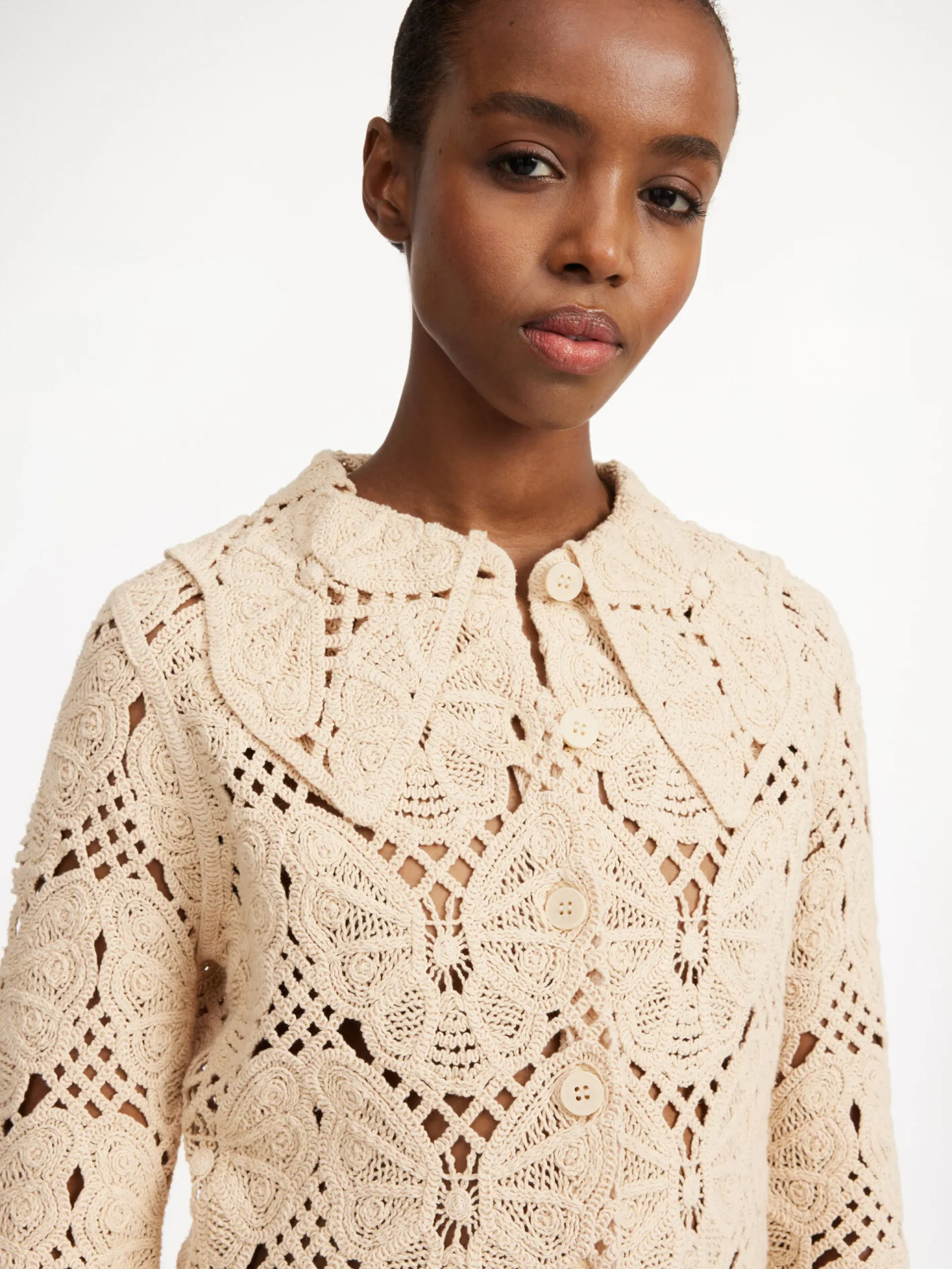 With a vintage-inspired vibe, the Gwenevere shirt is made in a distinctive butterfly crochet. Ultrafeminine, the delicate silhouette is detailed with a large, curved collar, elongated sleeves, and buttons down the front. Pair with the matching Cantala skirt or over the Falla dress.