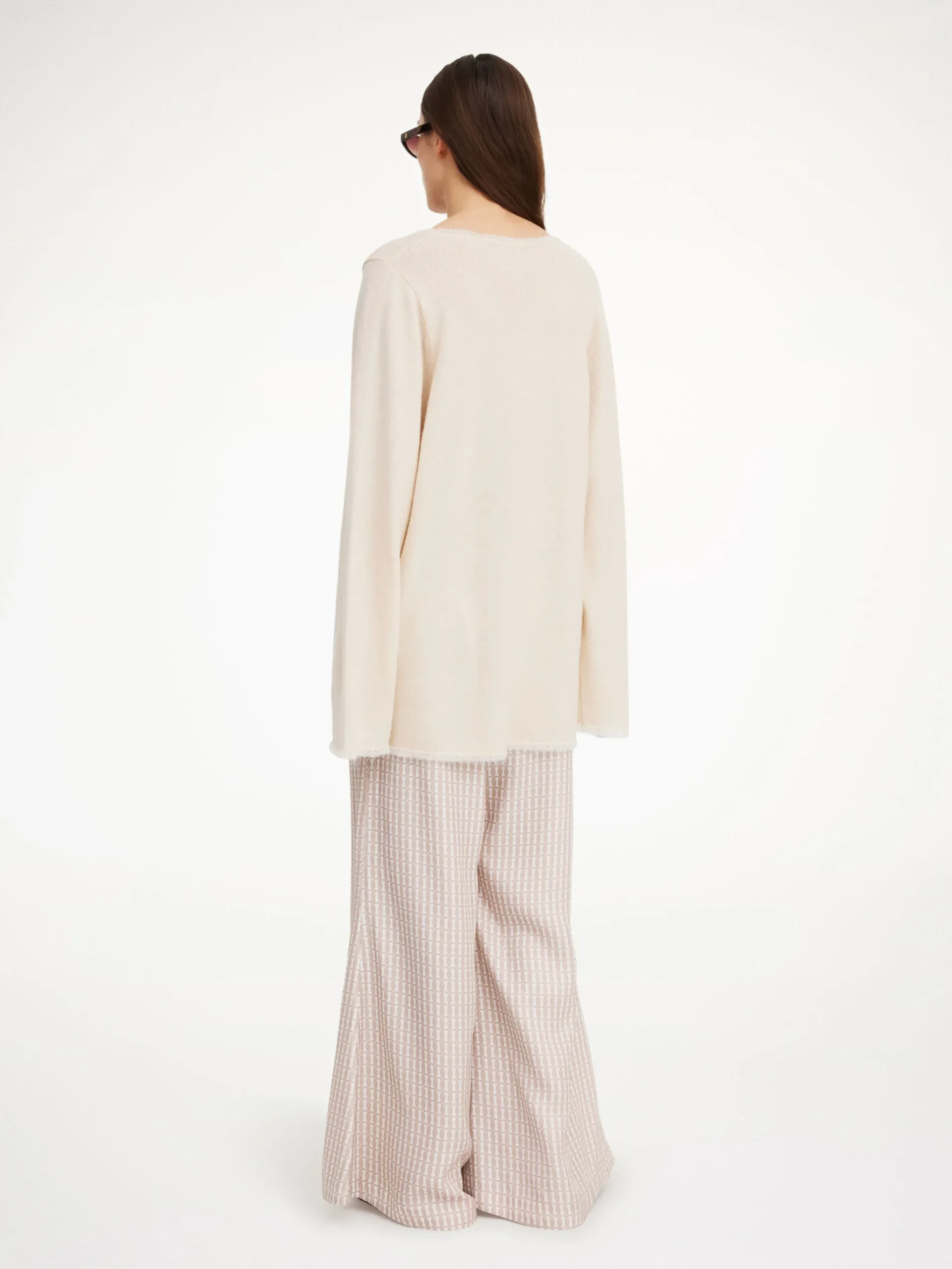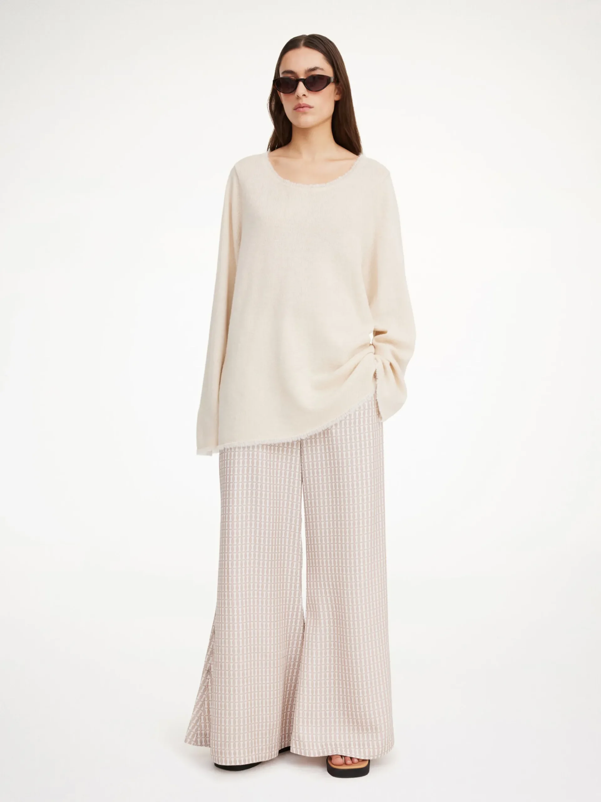 By Malene Birger Luise sweater knitted from merino wool and yak. It has a relaxed silhouette framed by a curved neckline and spacious long sleeves. Wear it with silk trousers and flats when working from home.