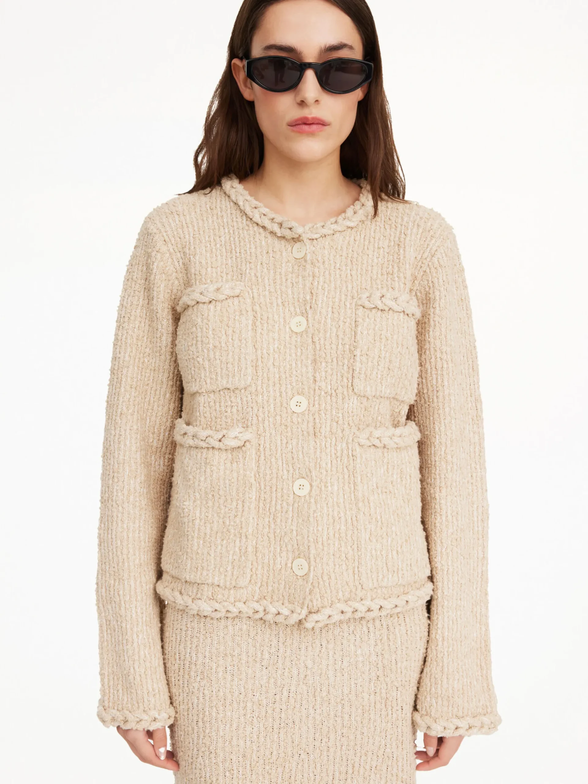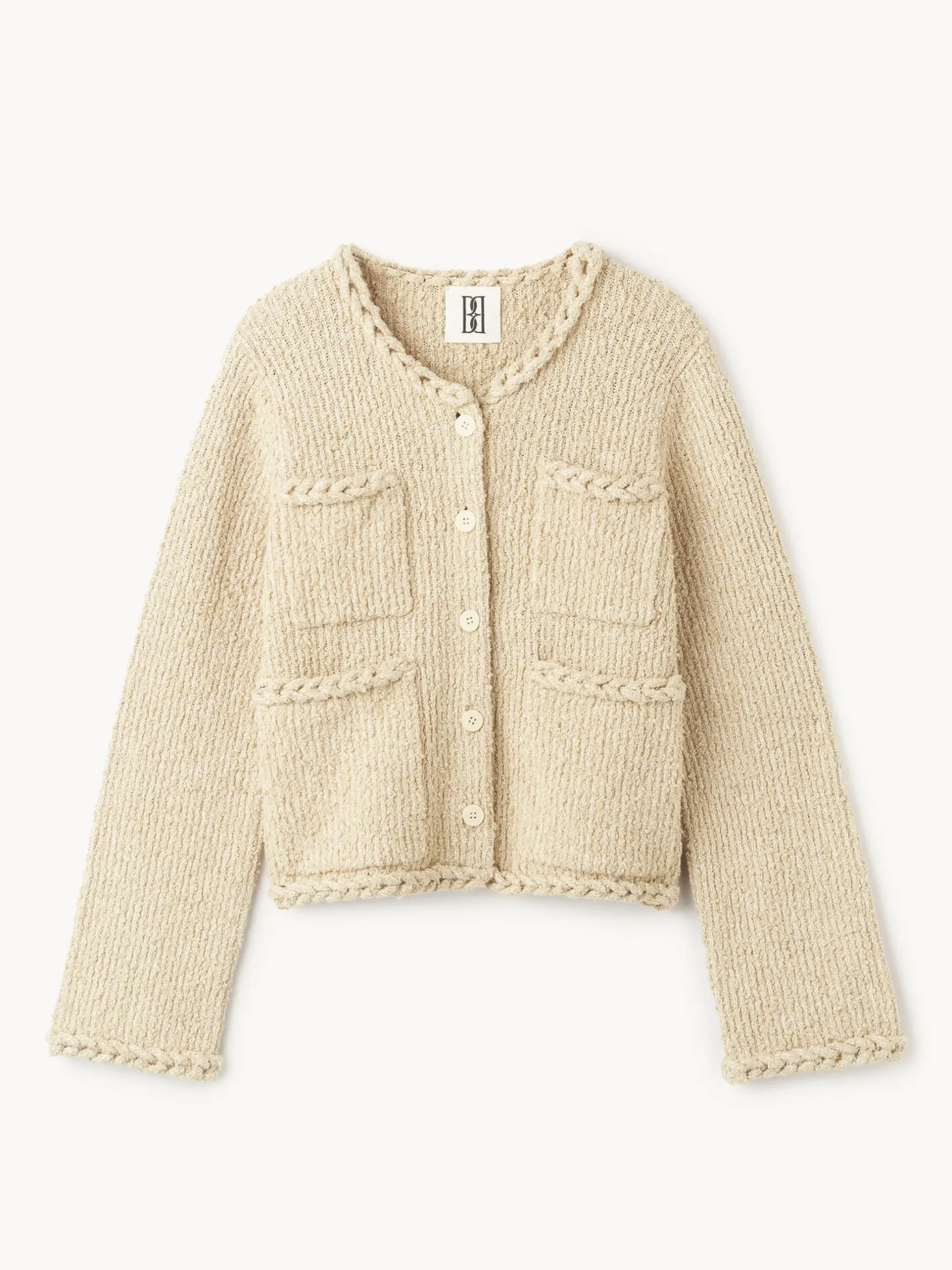 Easy elegance defines the Mariko cardigan. Knitted from a heavy cotton-linen blend, the considered design features braided hems, several front pockets, and a button closure. Pair with the matching Komi skirt.