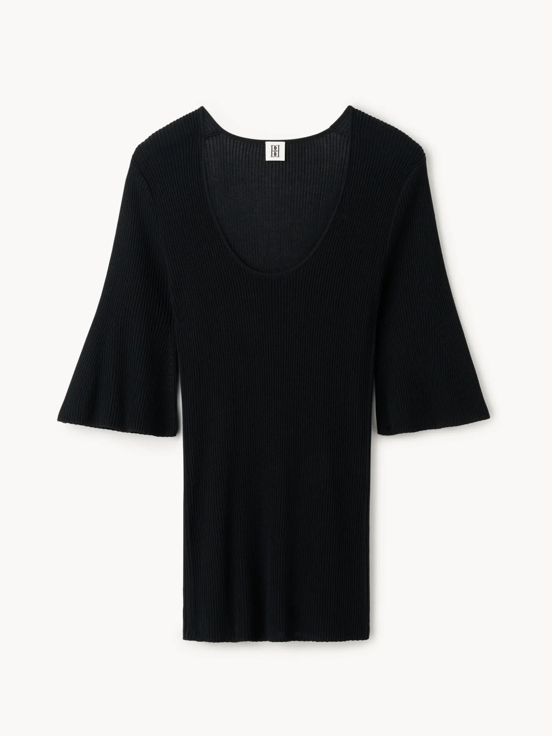 A versatile staple, this ribbed-knit top is minimally detailed with cropped sleeves and a wide neckline. Layer yours under a blazer or tuck into jeans.