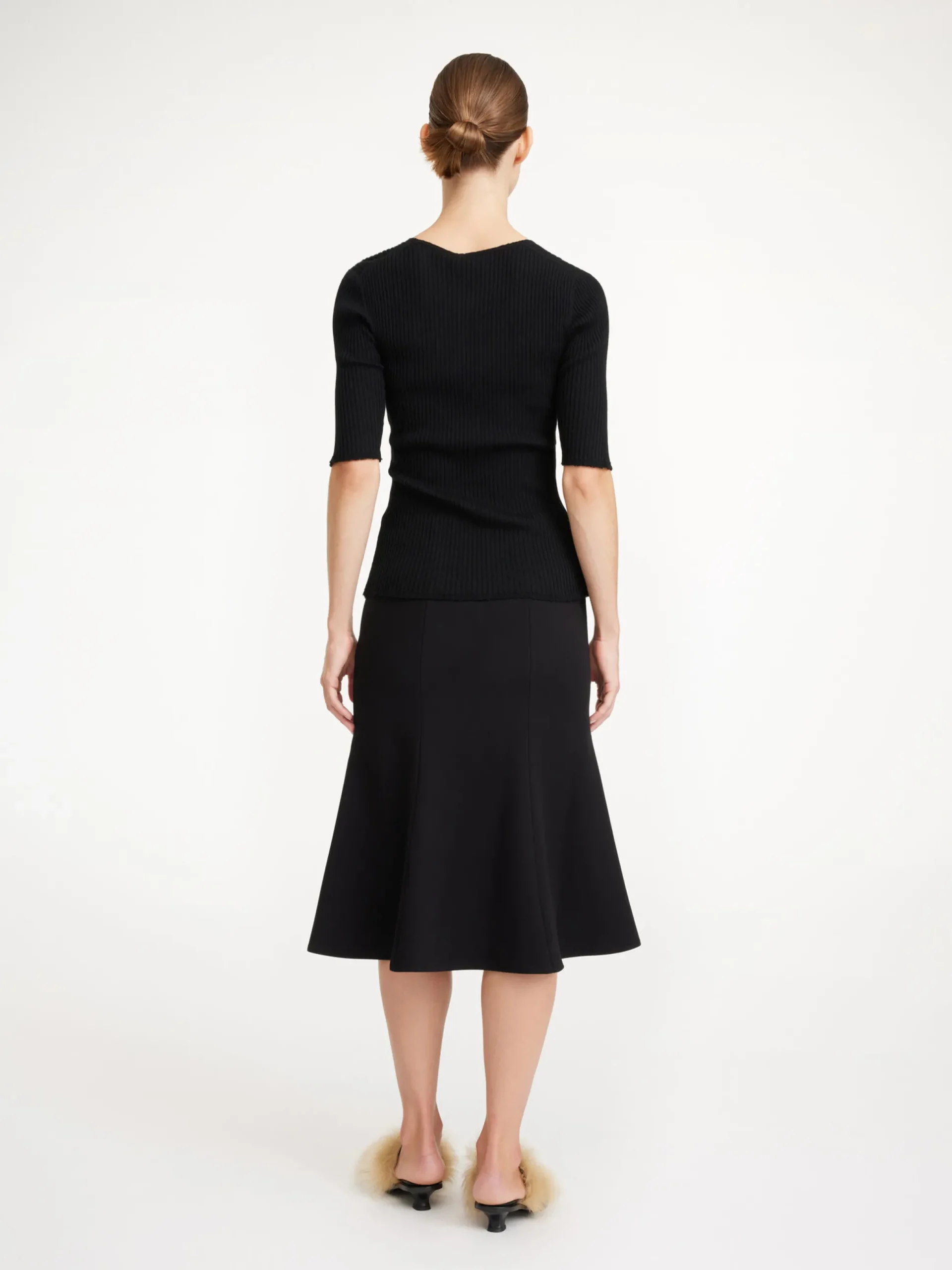 By Malene Birger Remoni top knitted from thin merino wool that is soft to the touch. It has a minimalist slim silhouette with a round neckline and above-the-elbow sleeves. Tuck it into jeans or wide-leg trousers for an easy office day.