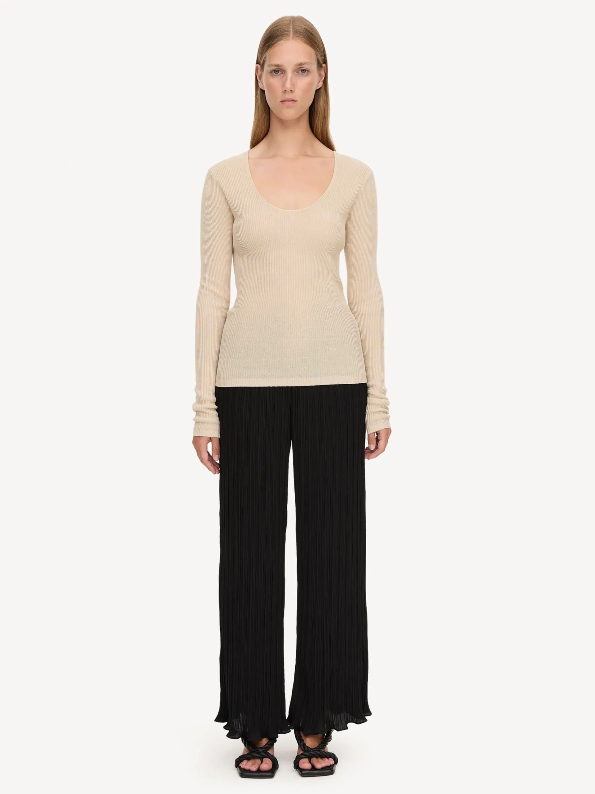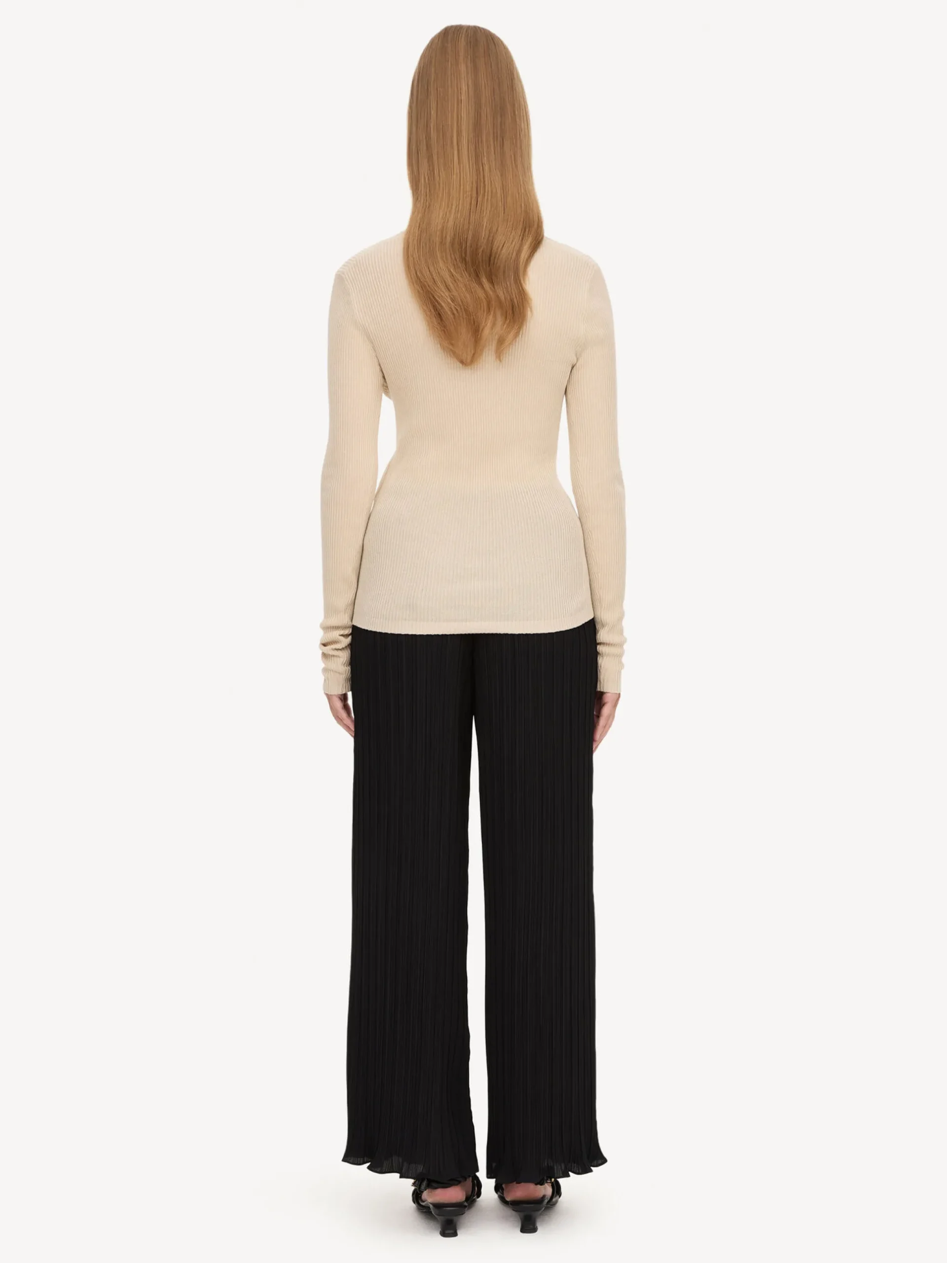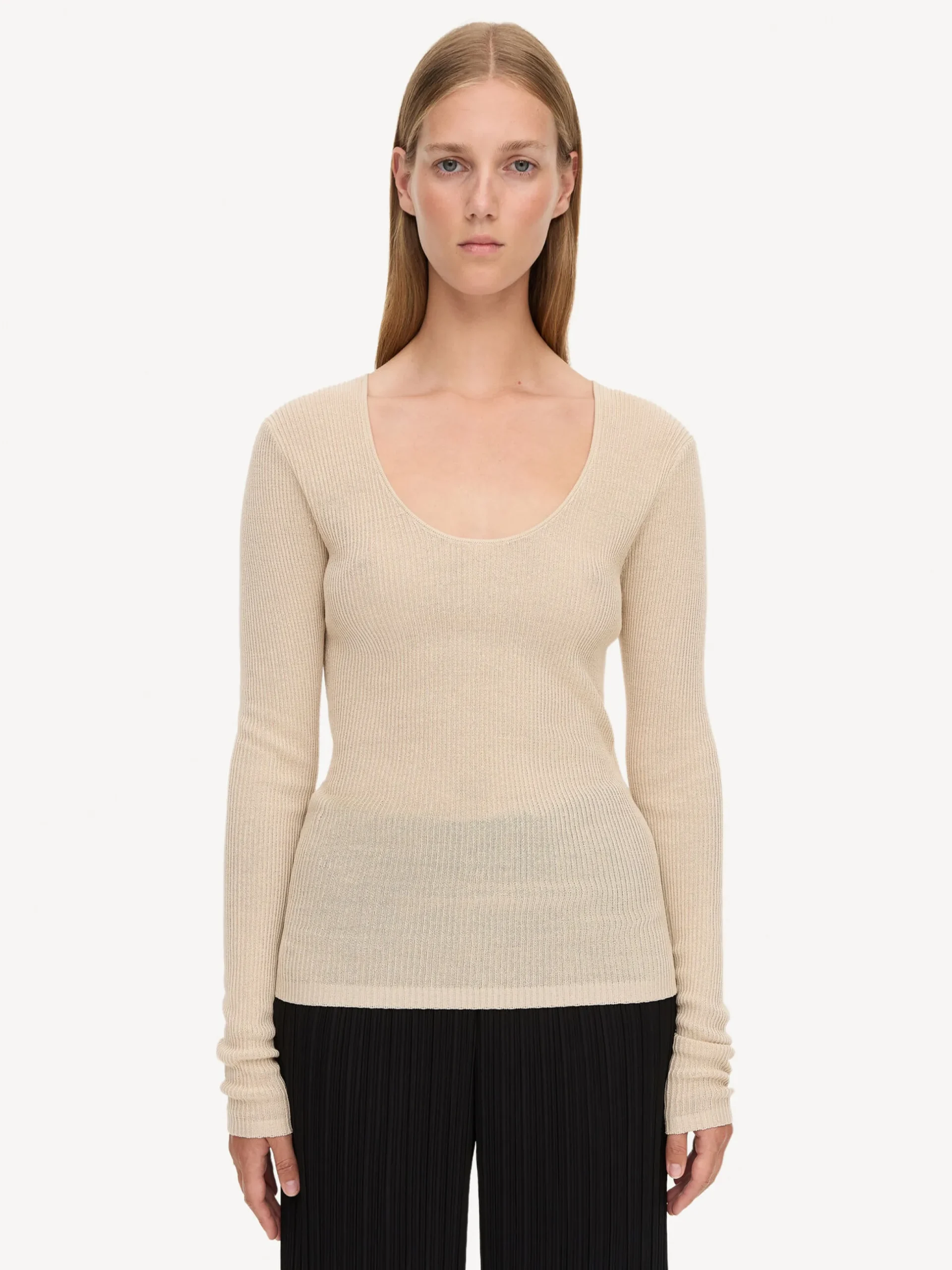 By Malene Birger Rinah top cut from a featherlight Lyocell with a ribbed structure. It features a round neck, long sleeves, and a fitted silhouette. Pair it with an elegant suit for a well-balanced office ensemble or a pair of jeans to look put-together.