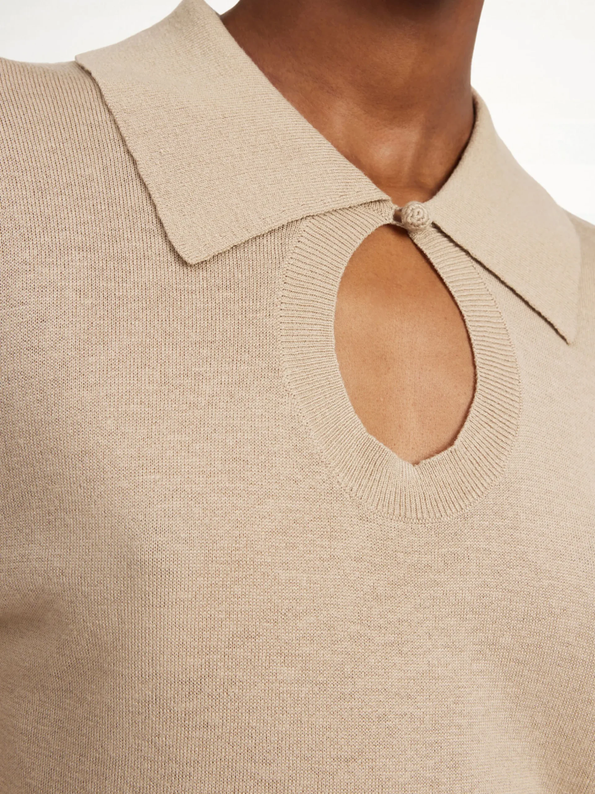 Made in a muted hue that works with everything in your wardrobe, the Talallia sweater is made from an ultra-lightweight wool-blend. The polo shirt inspired design is completed with a sharp collar, stretch hems and a smart key-hole cut-out detail in the neckline.