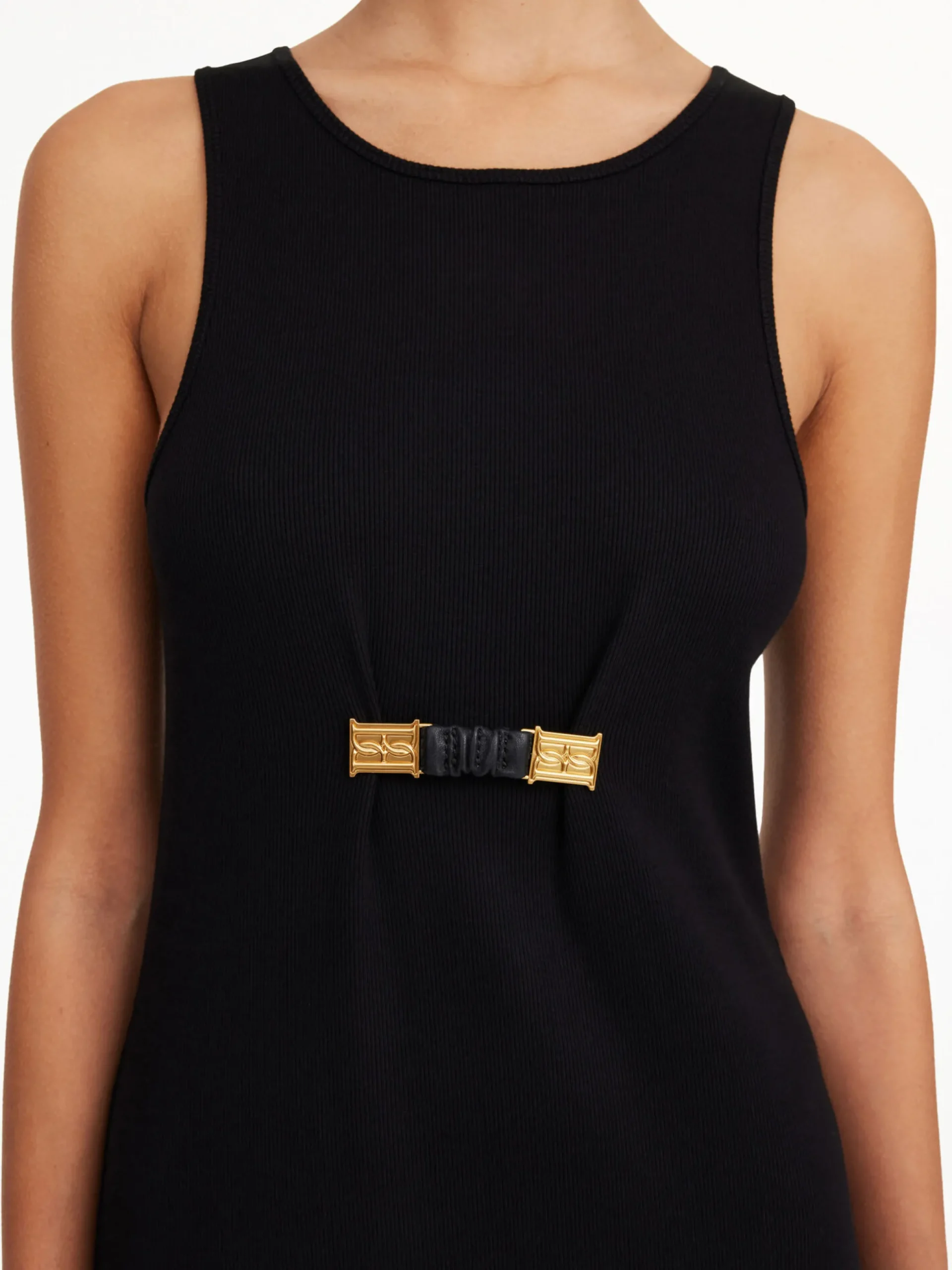 Crafted from buttery leather, the Jummis cuff fastens with our monogram. Use it on the Lovelo maxi dress to accentuate your waist.