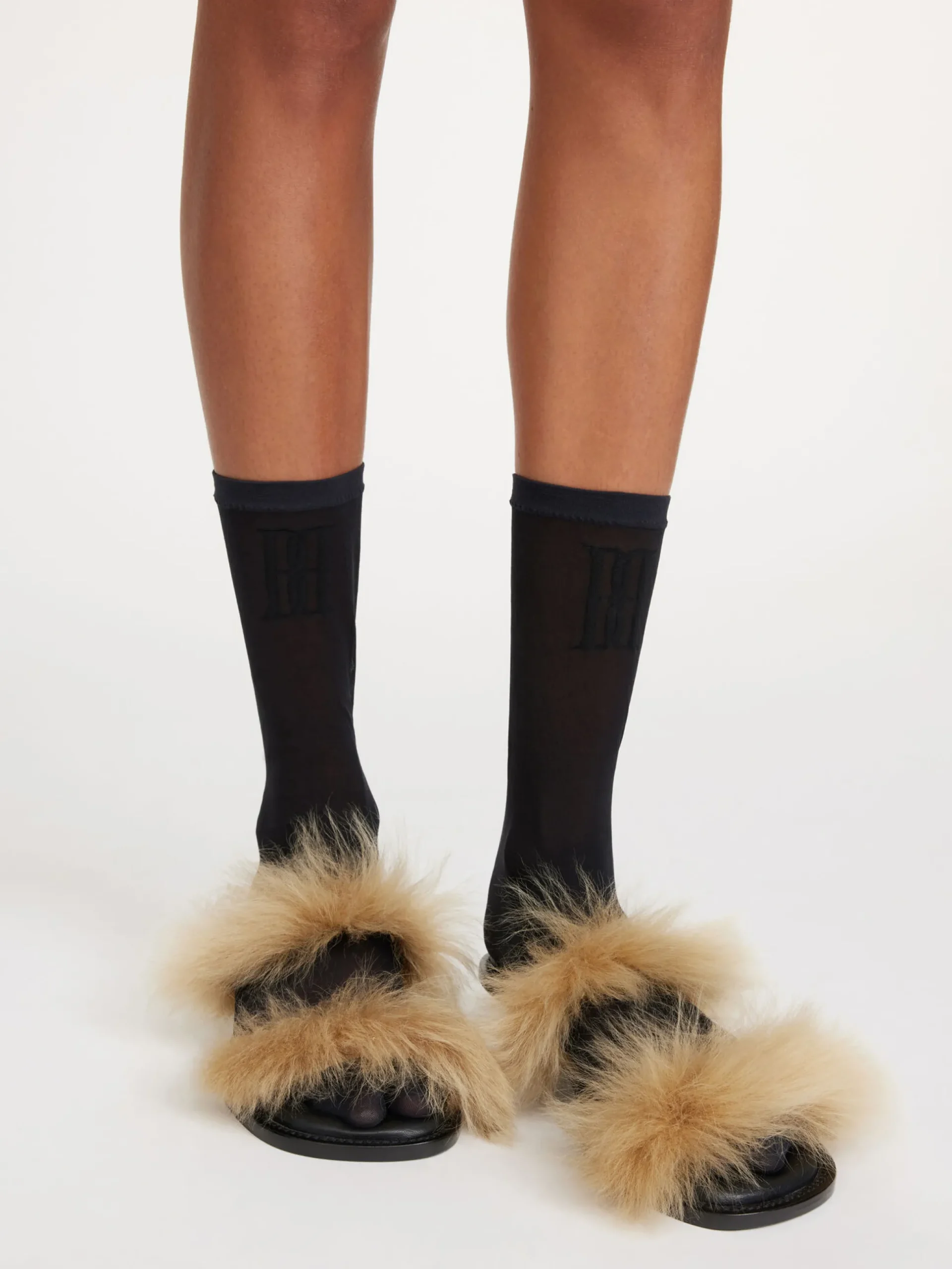 By Malene Birger Nylah socks knitted from a smooth fabric blend. They are designed with a thin cuff and a prominent monogram. Wear them with jeans and heeled mules to the office.
