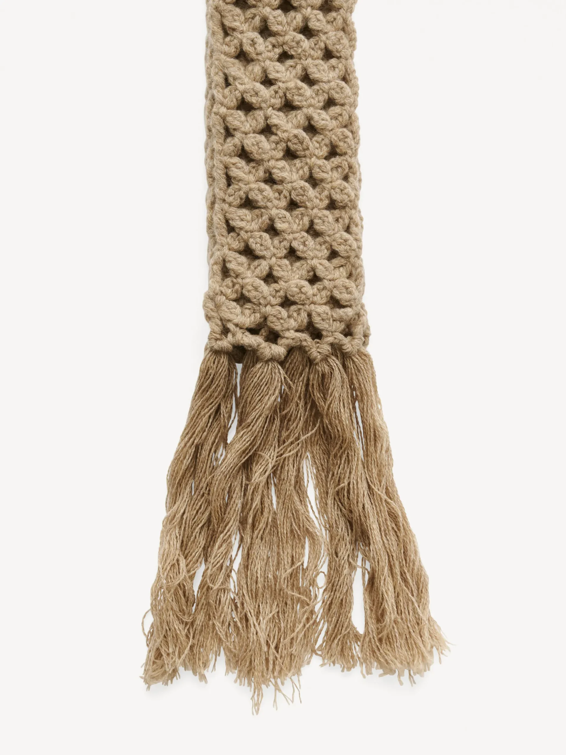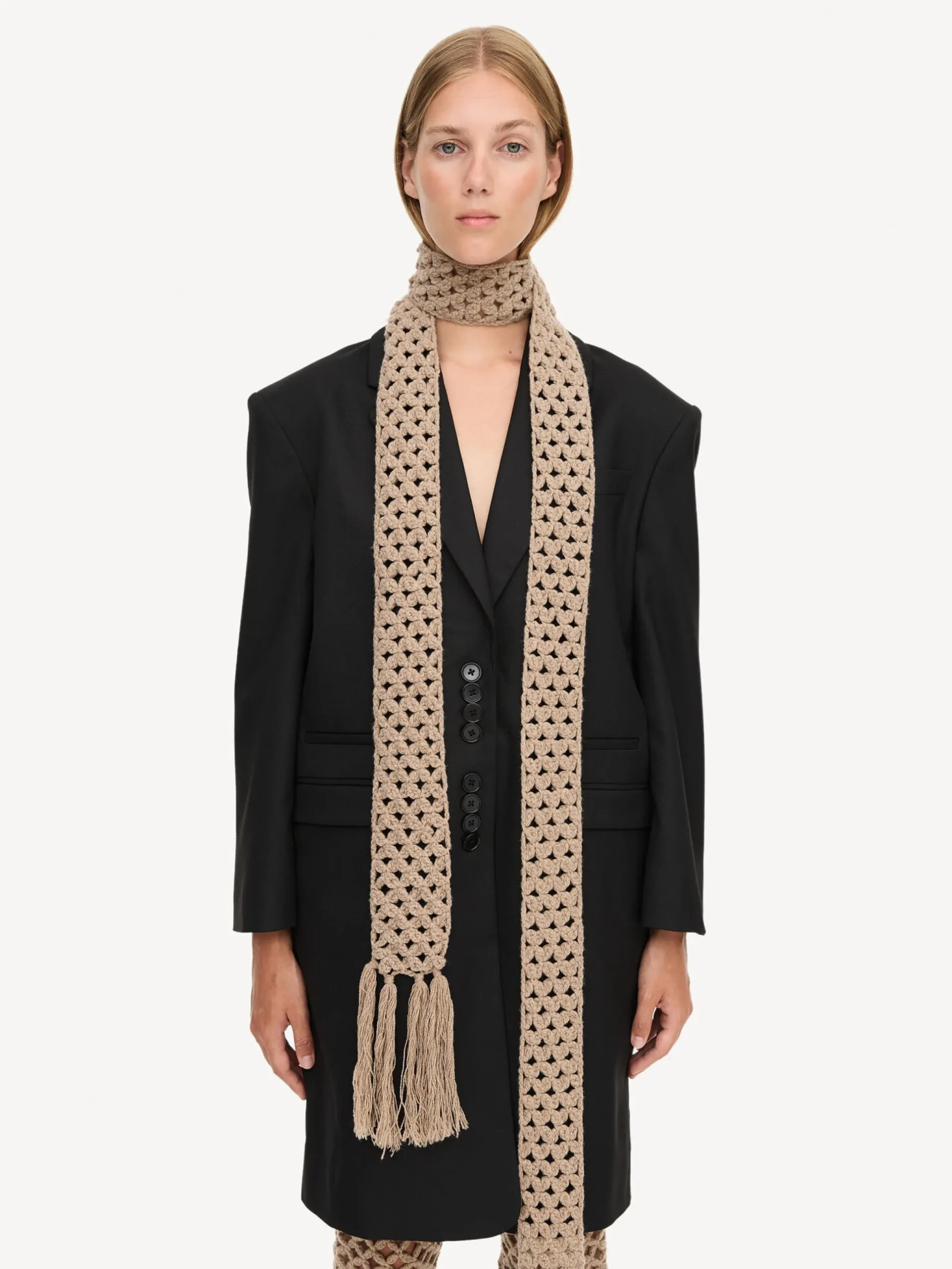 Knitted from soft wool into a crochet texture, the Wamone scarf is the definition of modern Bohemia. It has a slim and elongated design with plush fringes. Wrap it around your neck or let it fall loosely over your body.