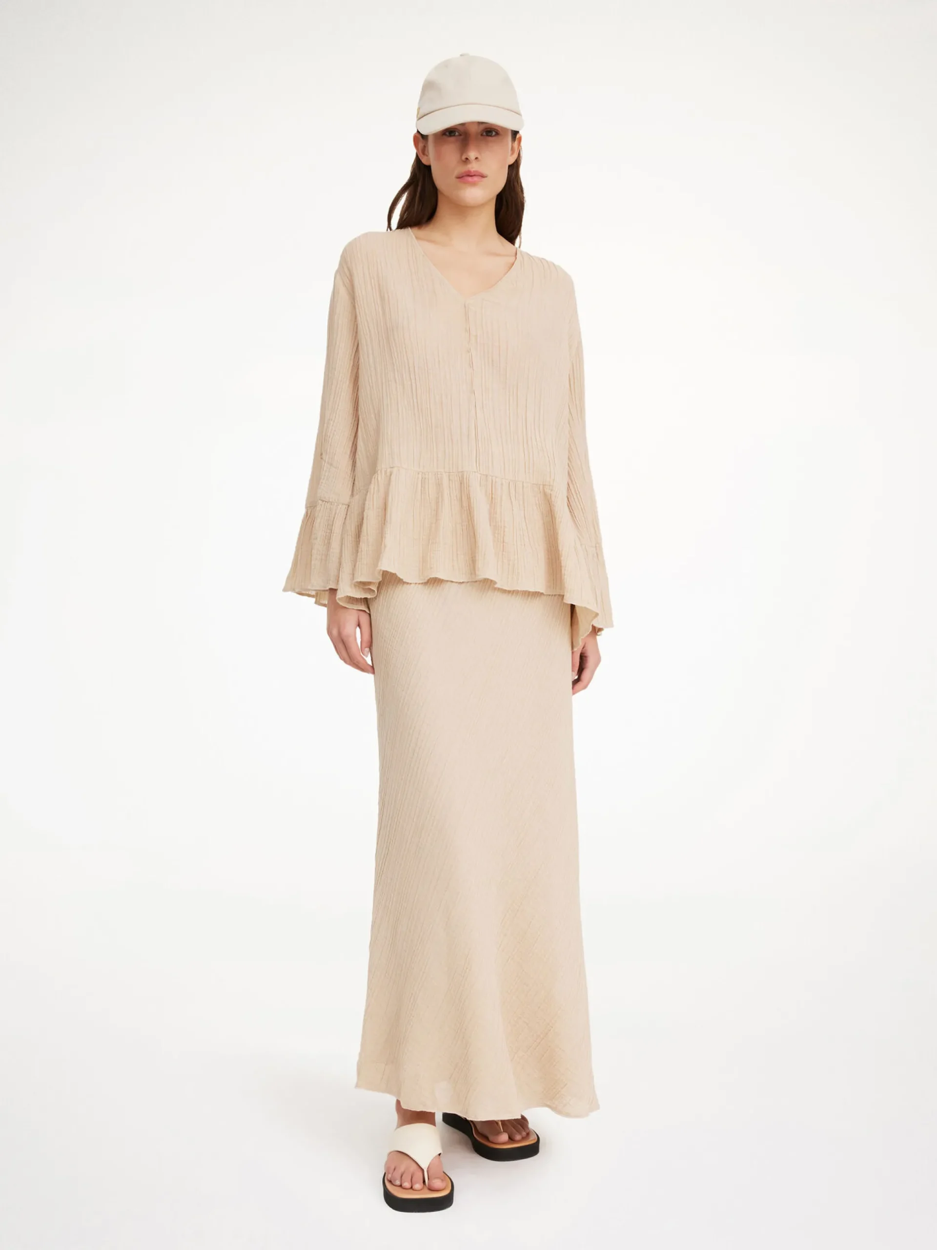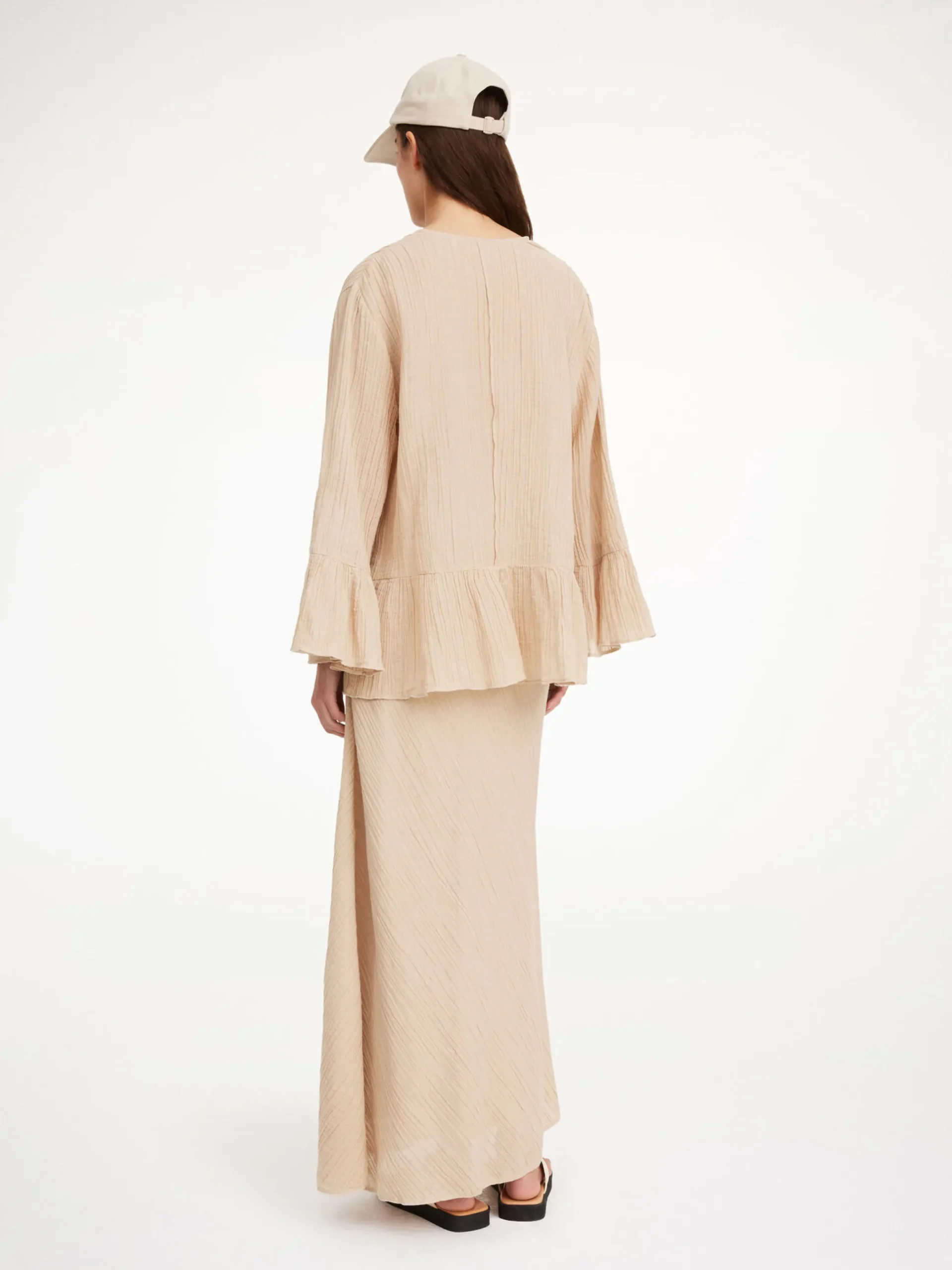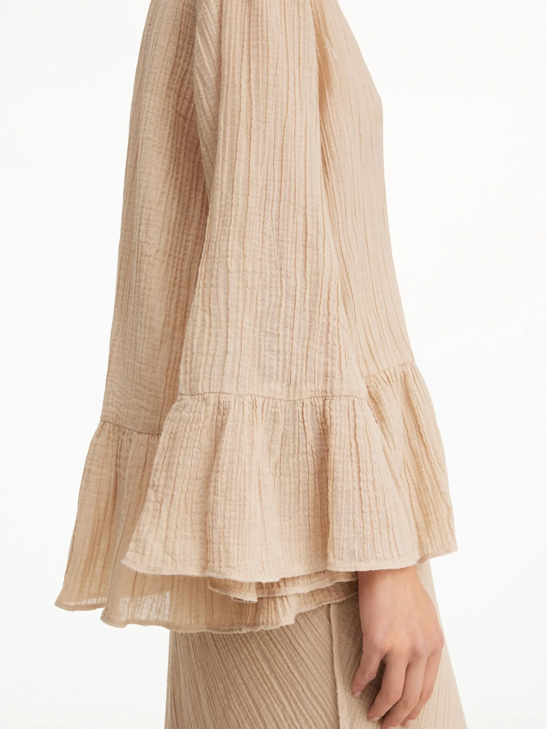 The Ophelies blouse easily transitions from desk to dinner. Crafted from breathable cotton and ramie with a lightweight handle, the loose design has a V-neck and wide ruffled trims. Continue the relaxed mood by layering over wide-leg trousers.