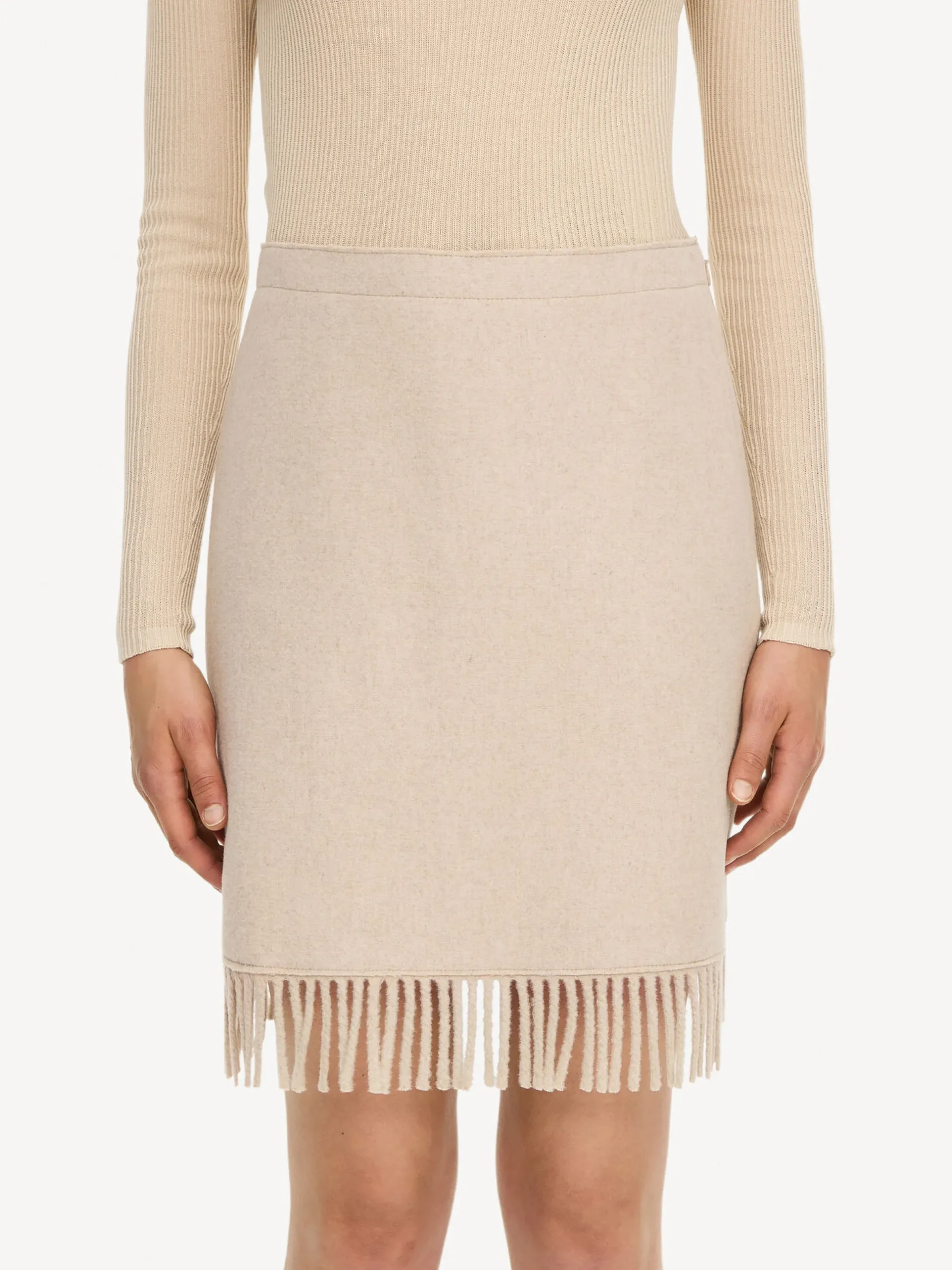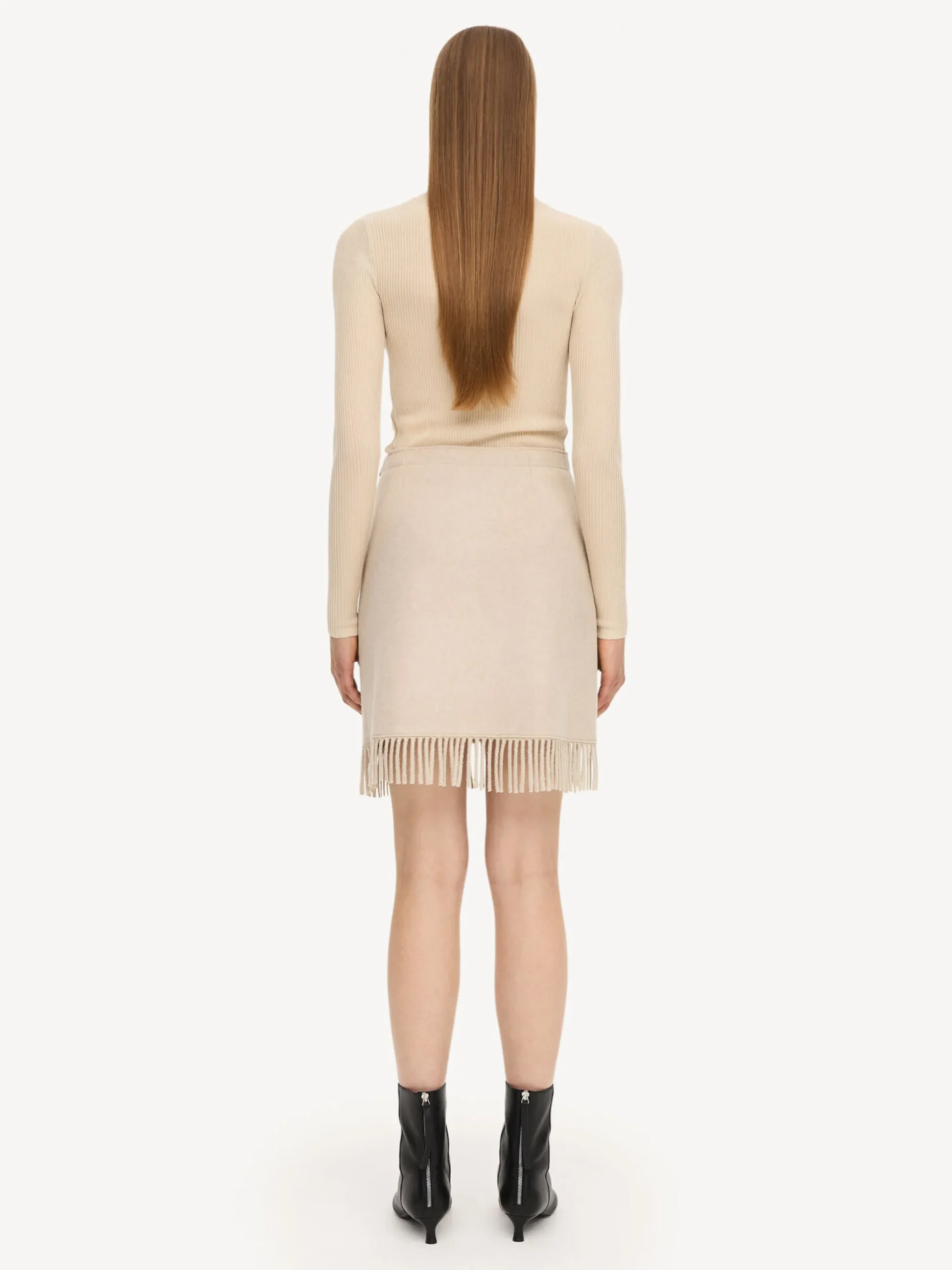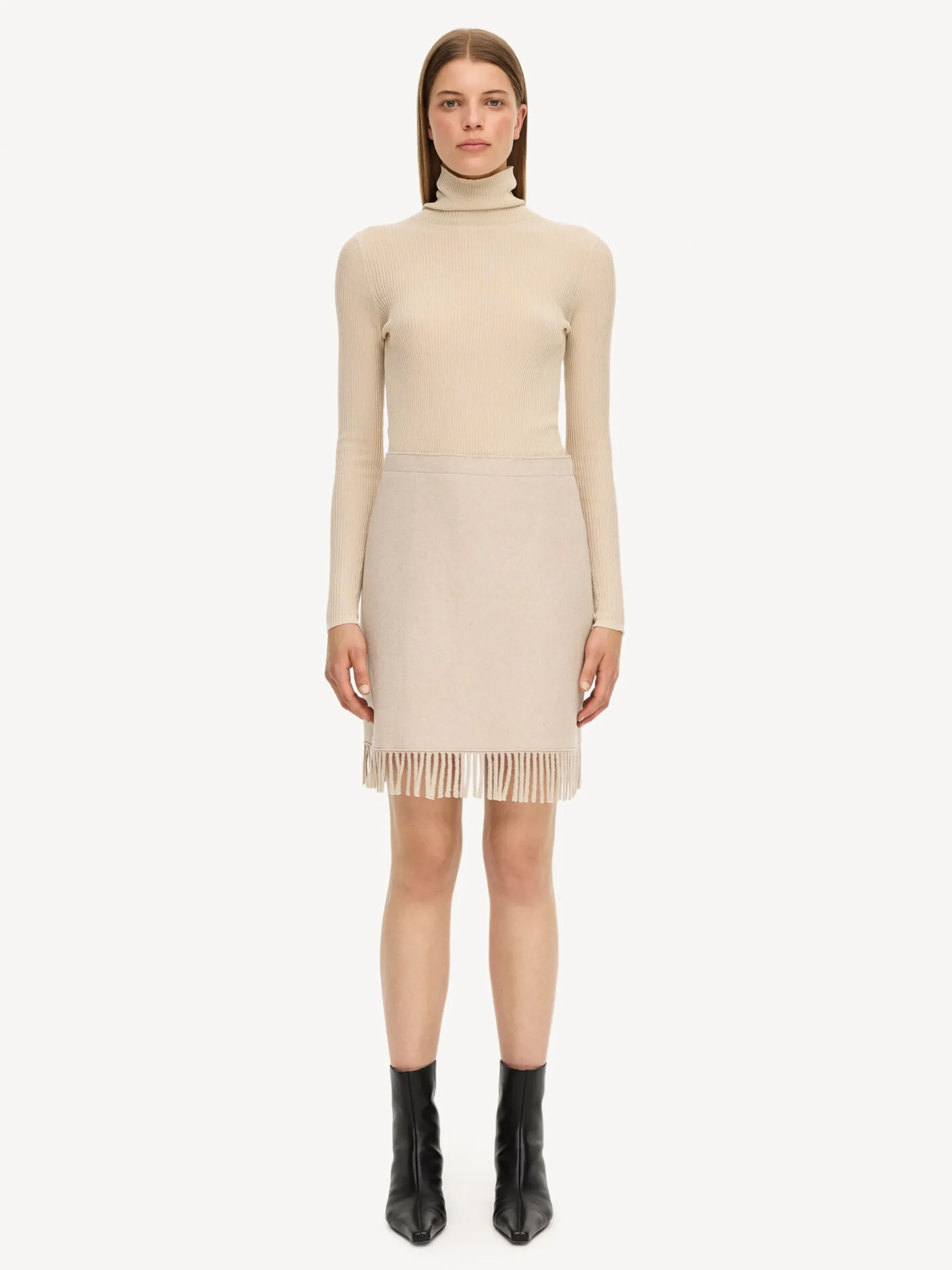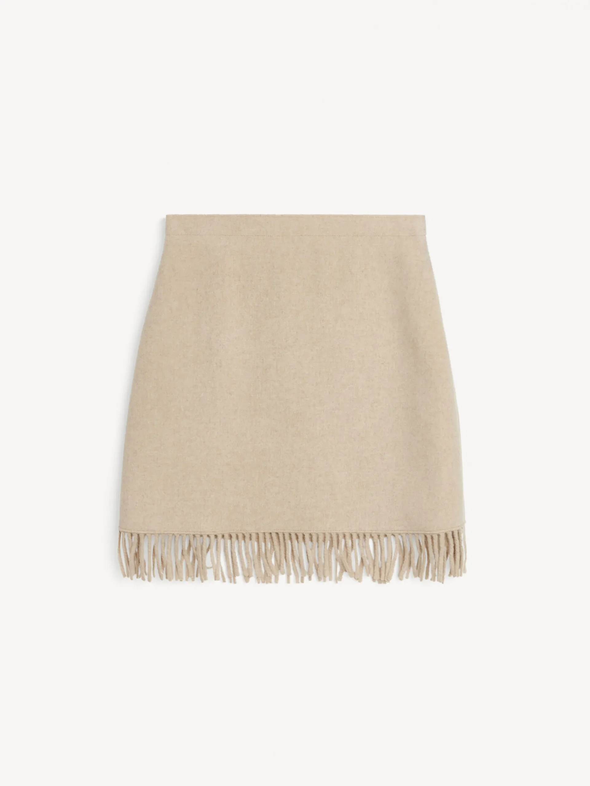 By Malene Birger Solir mini skirt with a high waist and a gentle A-line. It is crafted from a luxurious wool blend and features delicate fringes along the hemline. Match with the coordinating Iggie blazer for an updated take on tailoring.