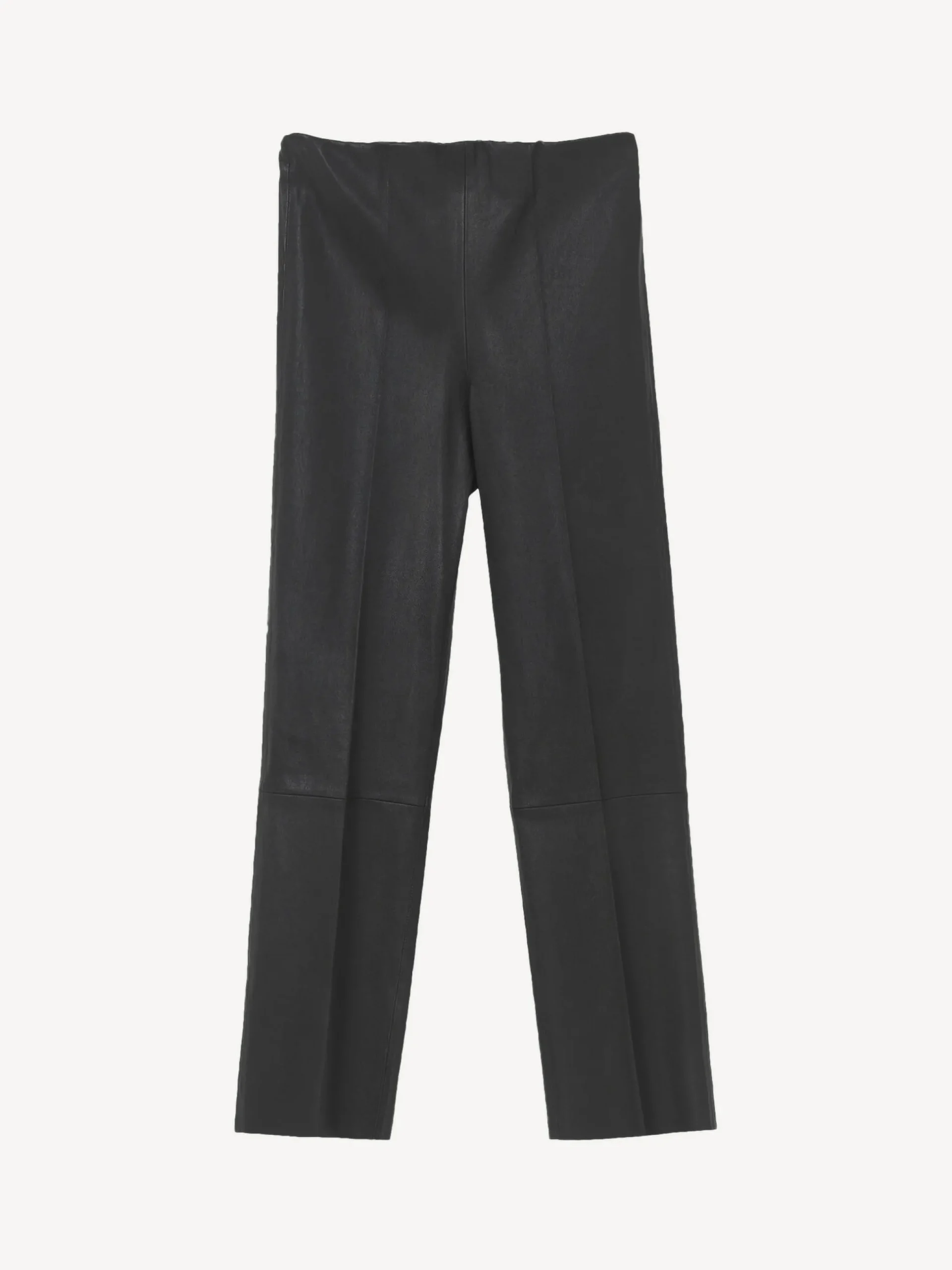 Cropped at the ankle and set on a flexible, elasticated waist, these leather trousers have universally flattering straight legs. They have pressed seams down the front and sit mid waist. Wear yours with everything from shirts to knitwear.