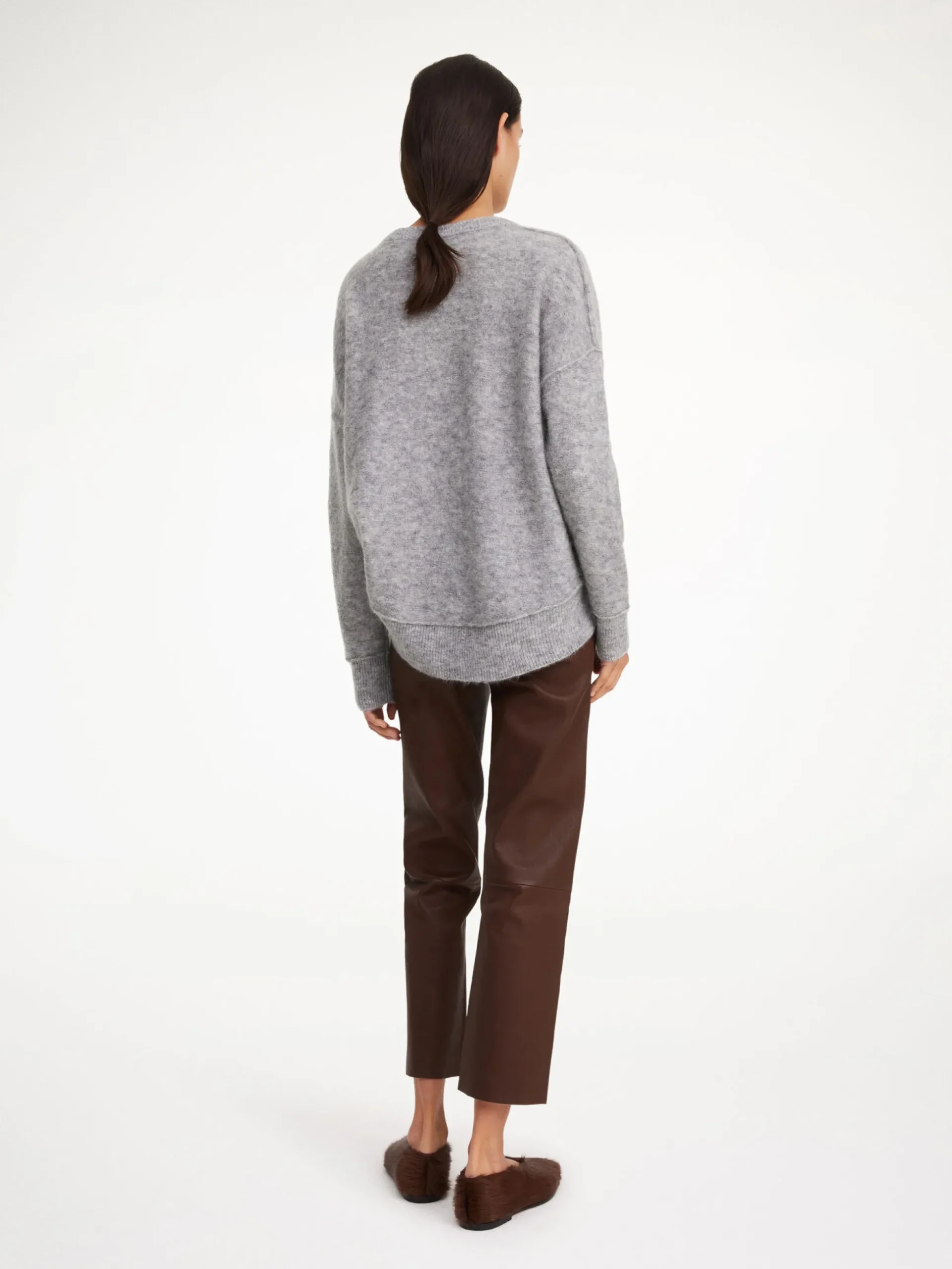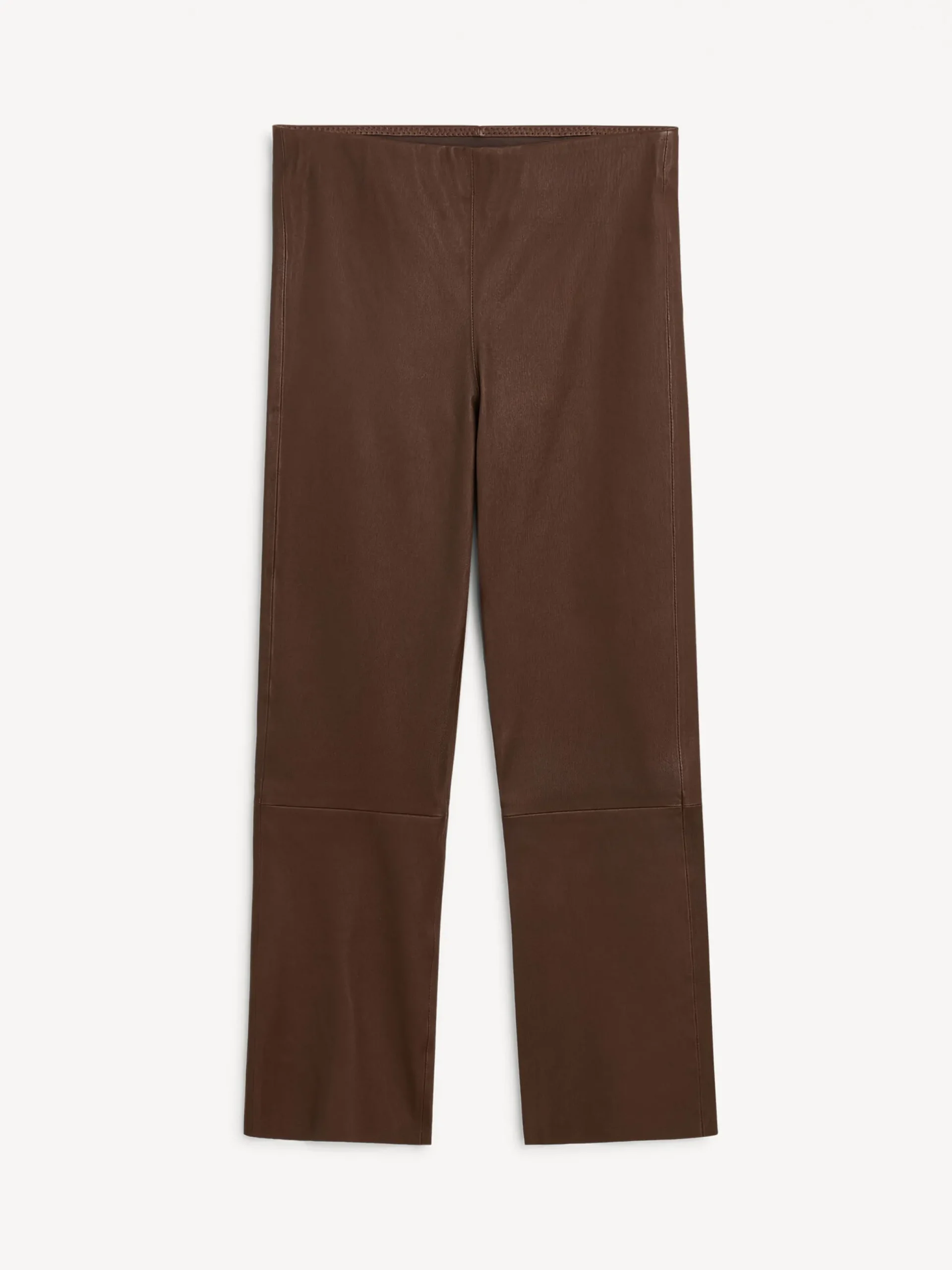 Cropped at the ankle and set on a flexible, elasticated waist, these leather trousers have universally flattering straight legs. They have pressed seams down the front and sit mid waist. Wear yours with everything from shirts to knitwear.