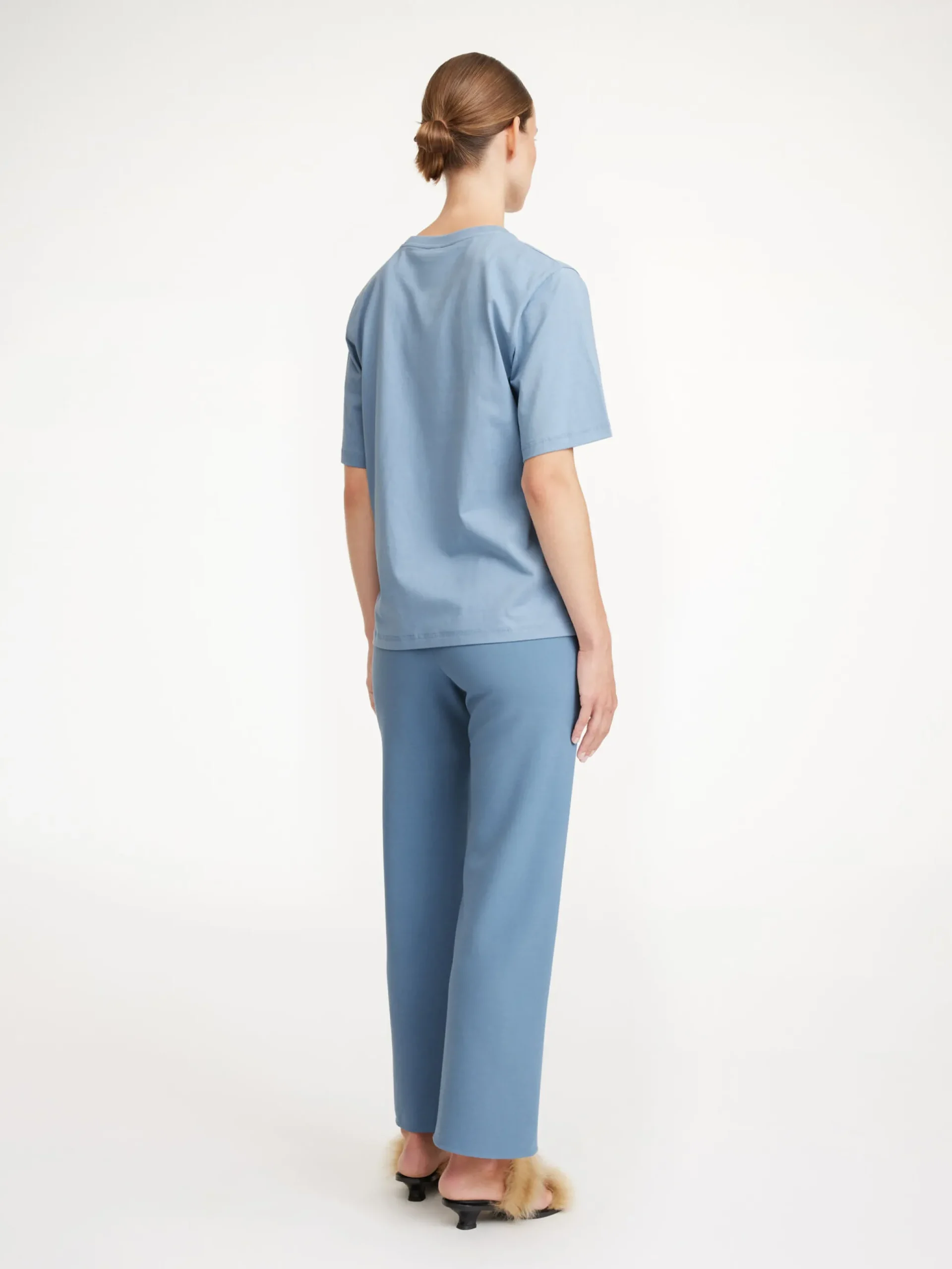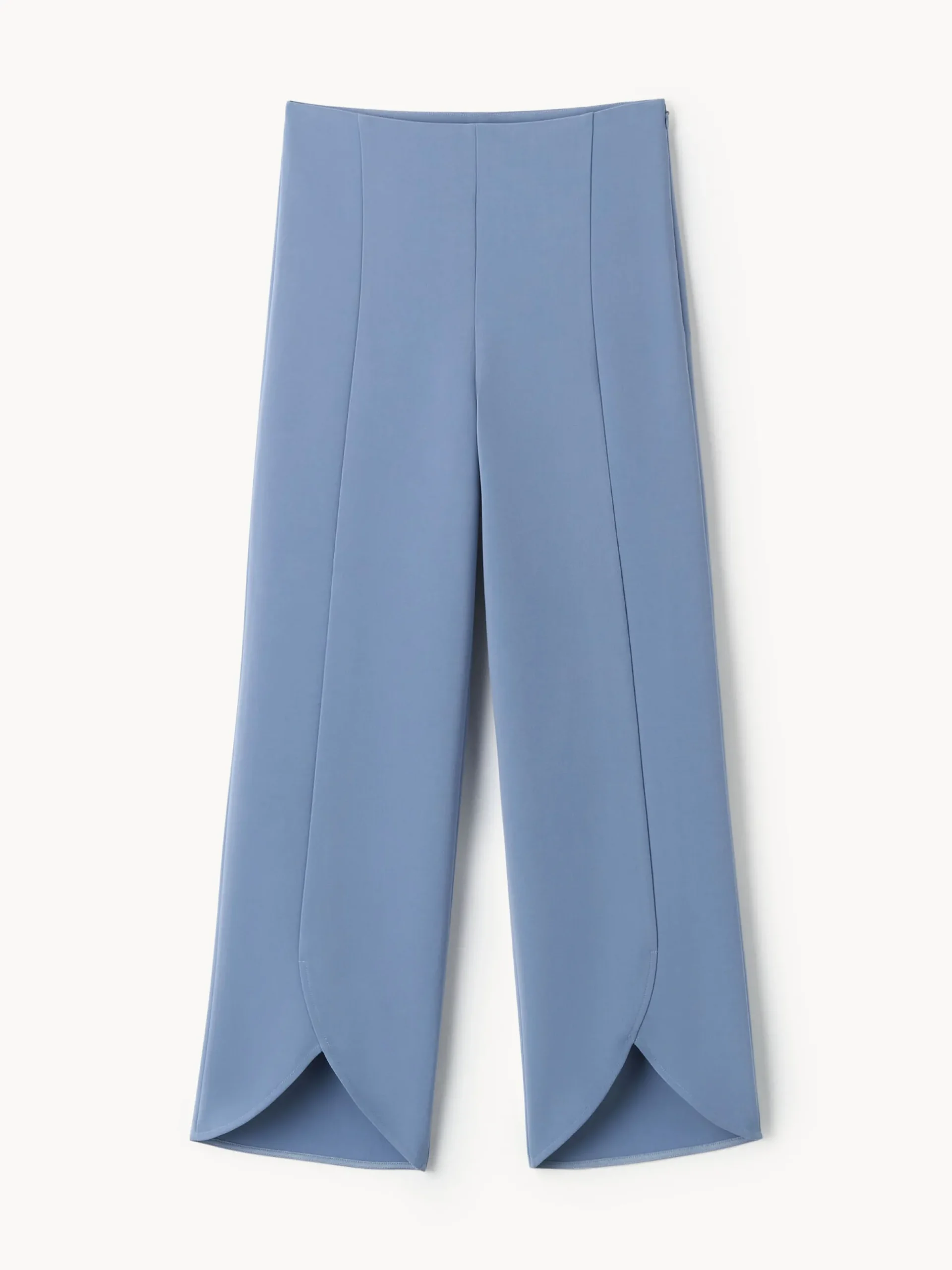 By Malene Birger Normann trousers woven to a slim silhouette that sits high on the waist. They are characterised by a vertical front tuck that softly opens into a cuff slit. Wear them with heels when you go out to drink.